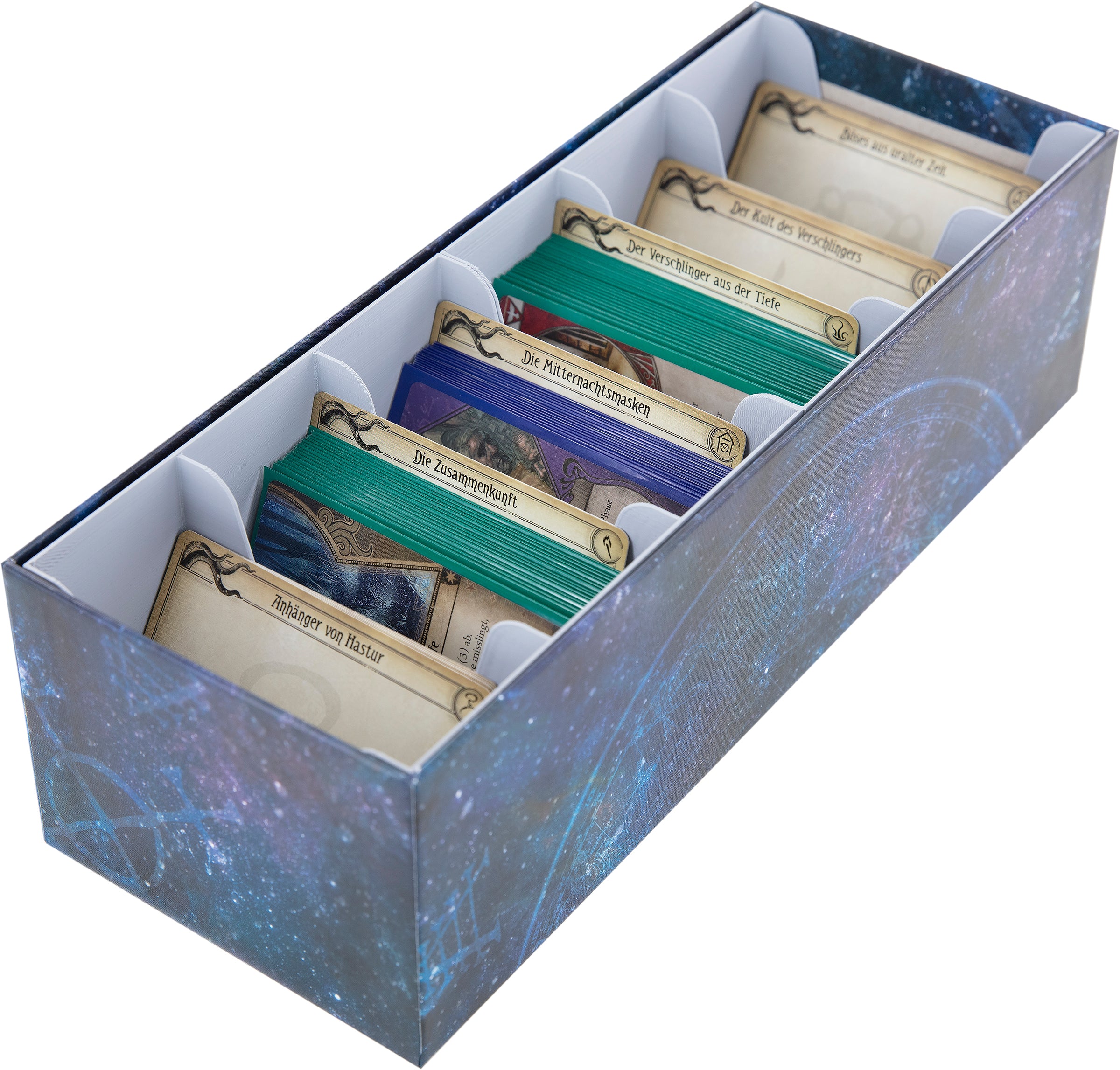 This insert consists of 2 plastic card holders and fits into the premium boxes of the expansions for Arkham Horror: The Card Game (e.g. for "Return to: The Night of the Zealot").