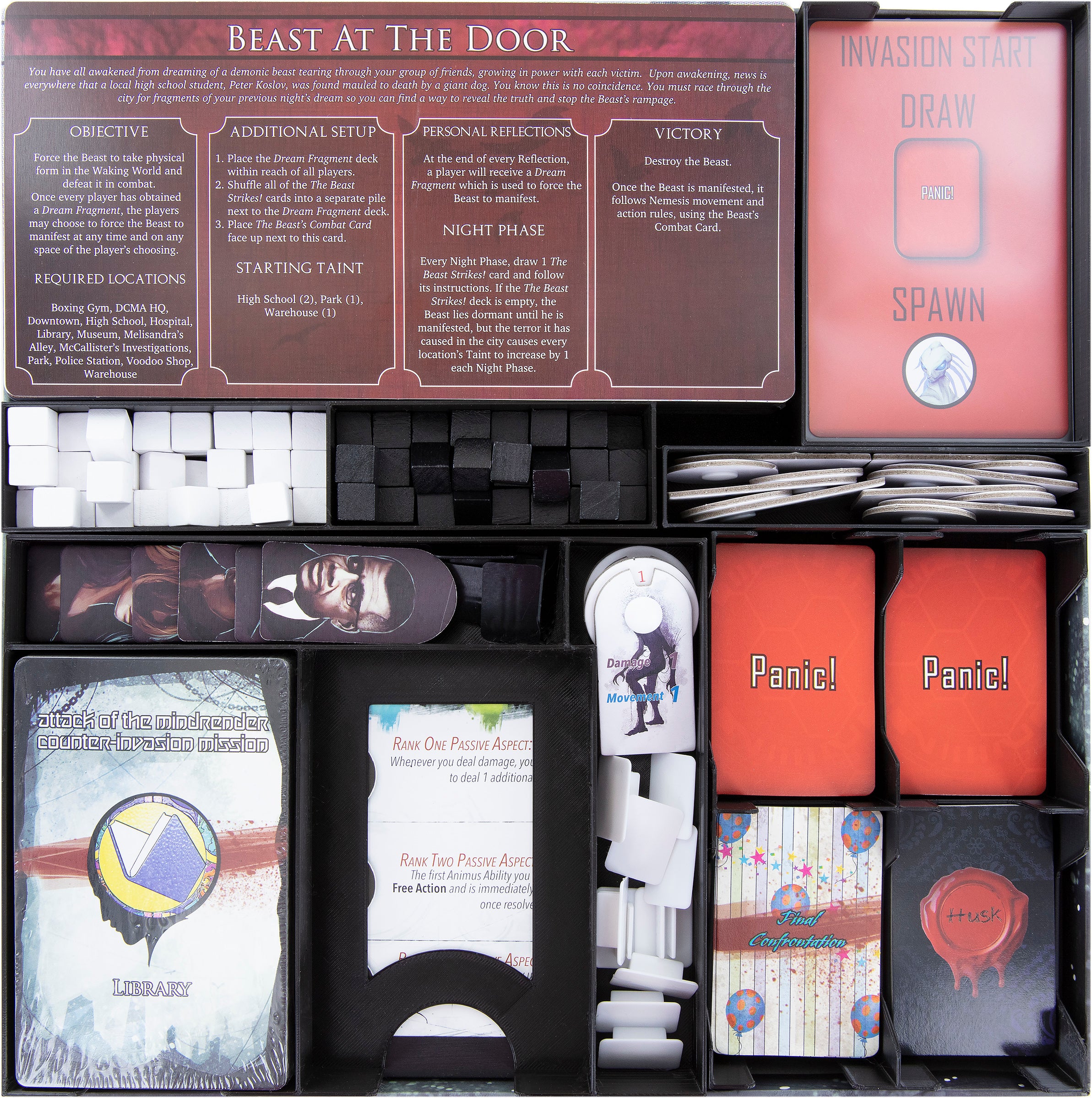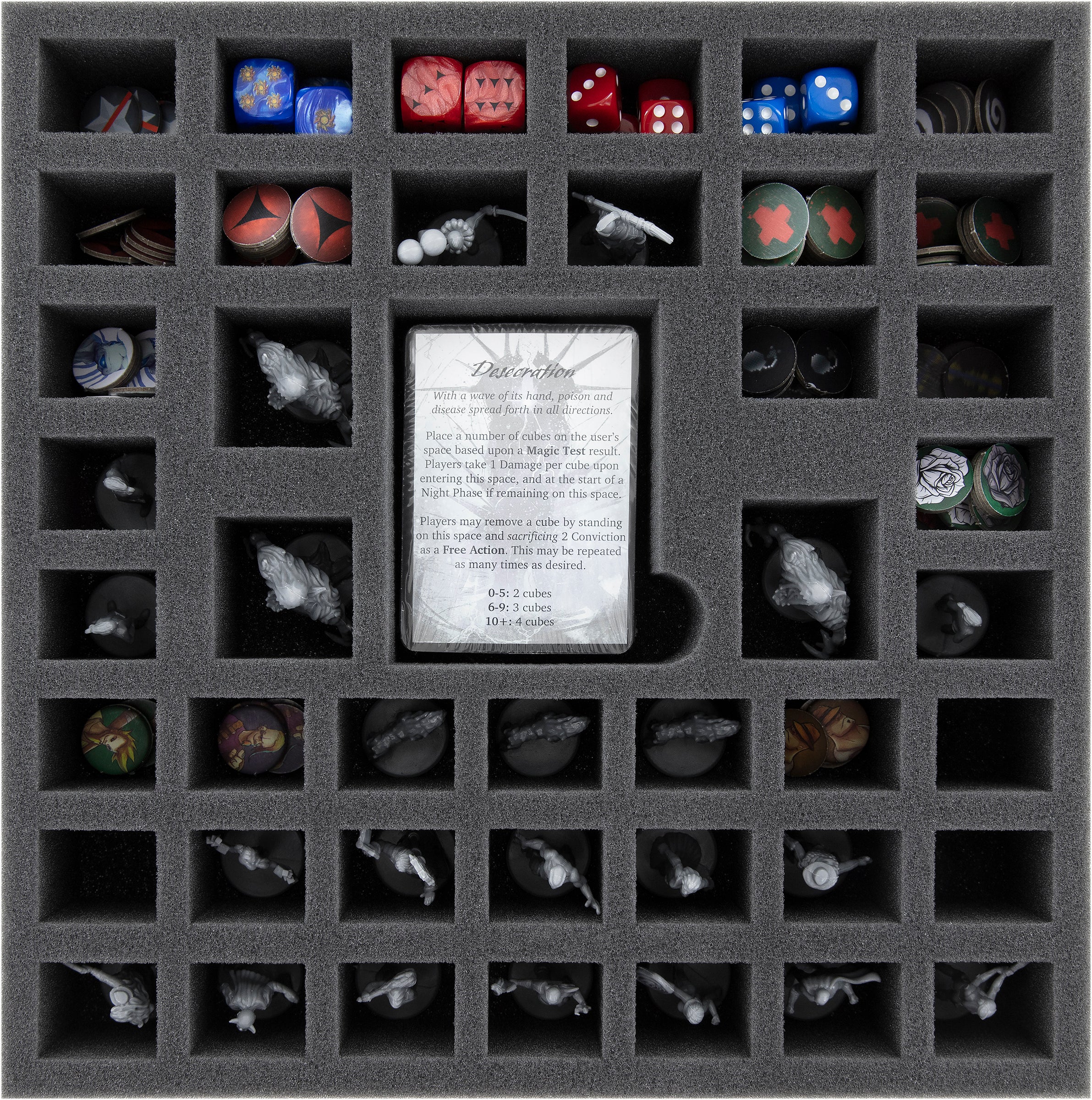 - 1 foam tray with 44 compartments for miniatures, dice, tokens and game cards (AWMEEB055BO)