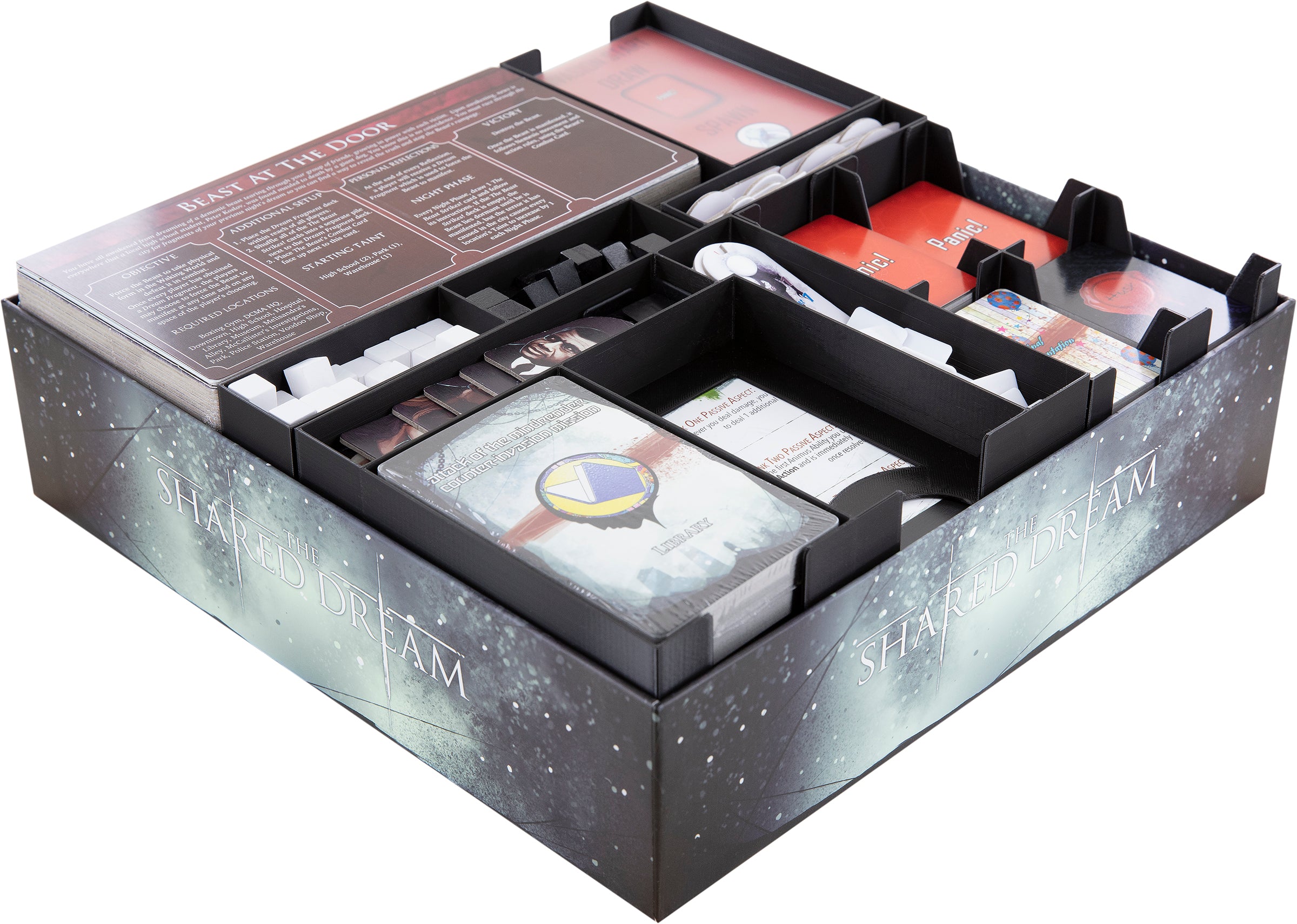 - The rule book, Anima and Animus Character Mats are stored on the Organizer. Shared Dream Scenario Cards and the various Tiles are placed next to them on the foam topper.