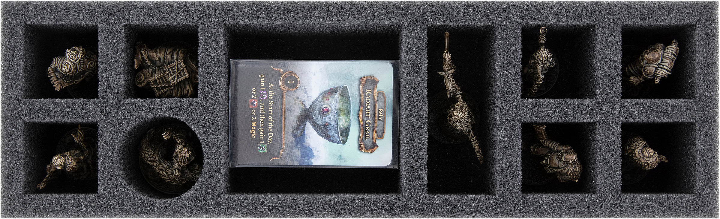 - 1 foam tray offers space for all 8 miniatures, the donkey from the Donkey Pack, and the small-sized cards