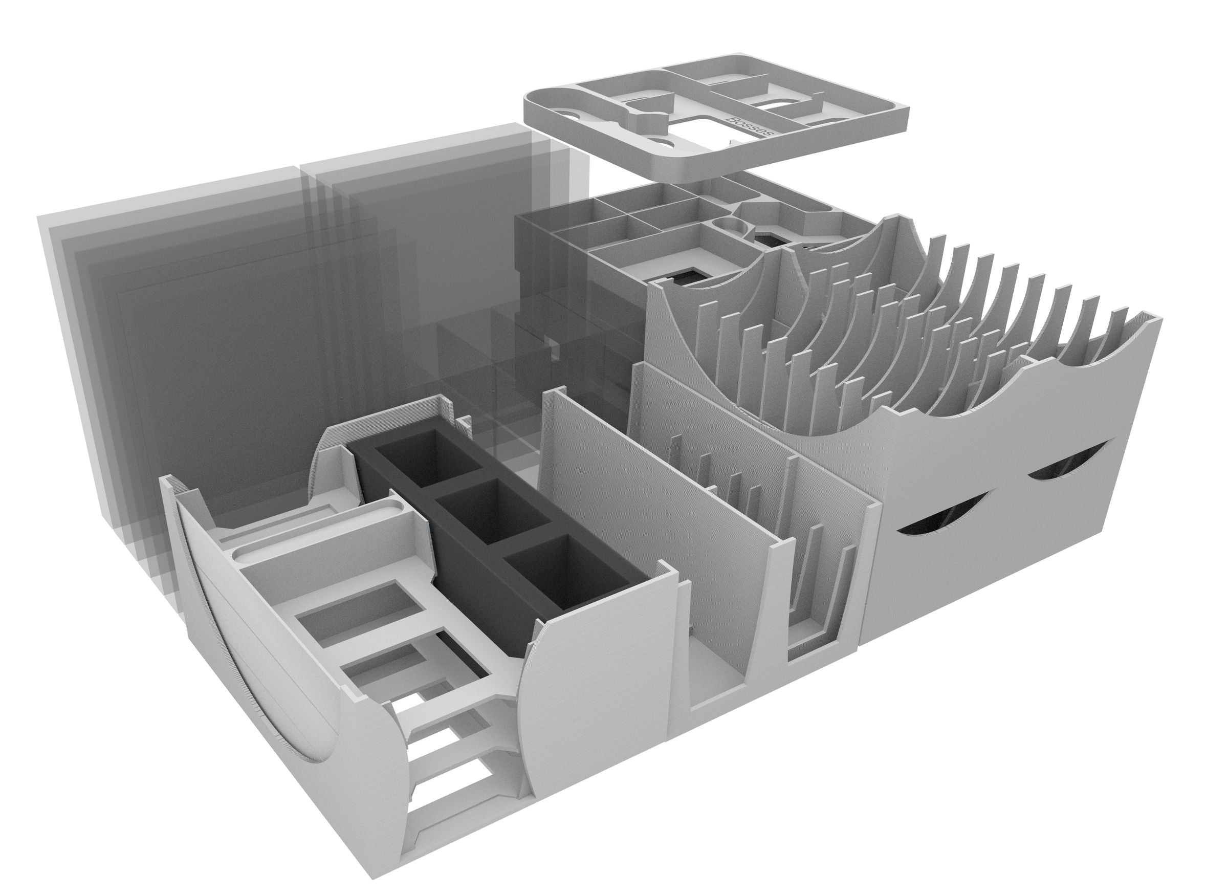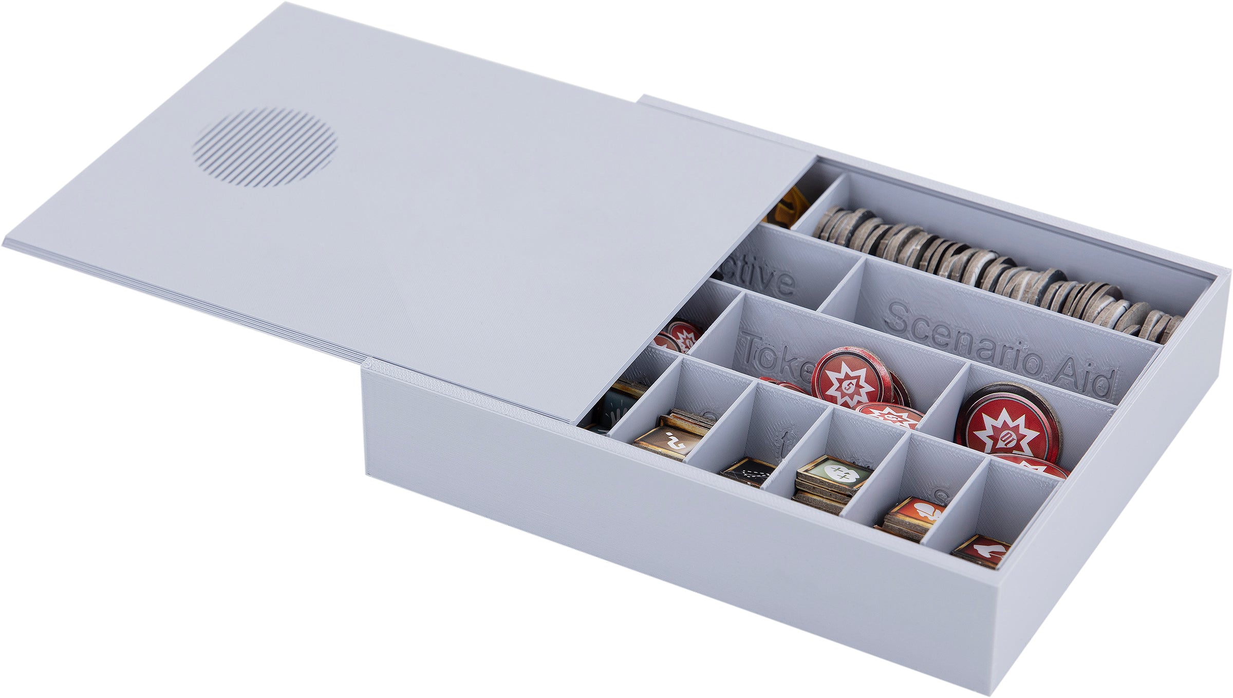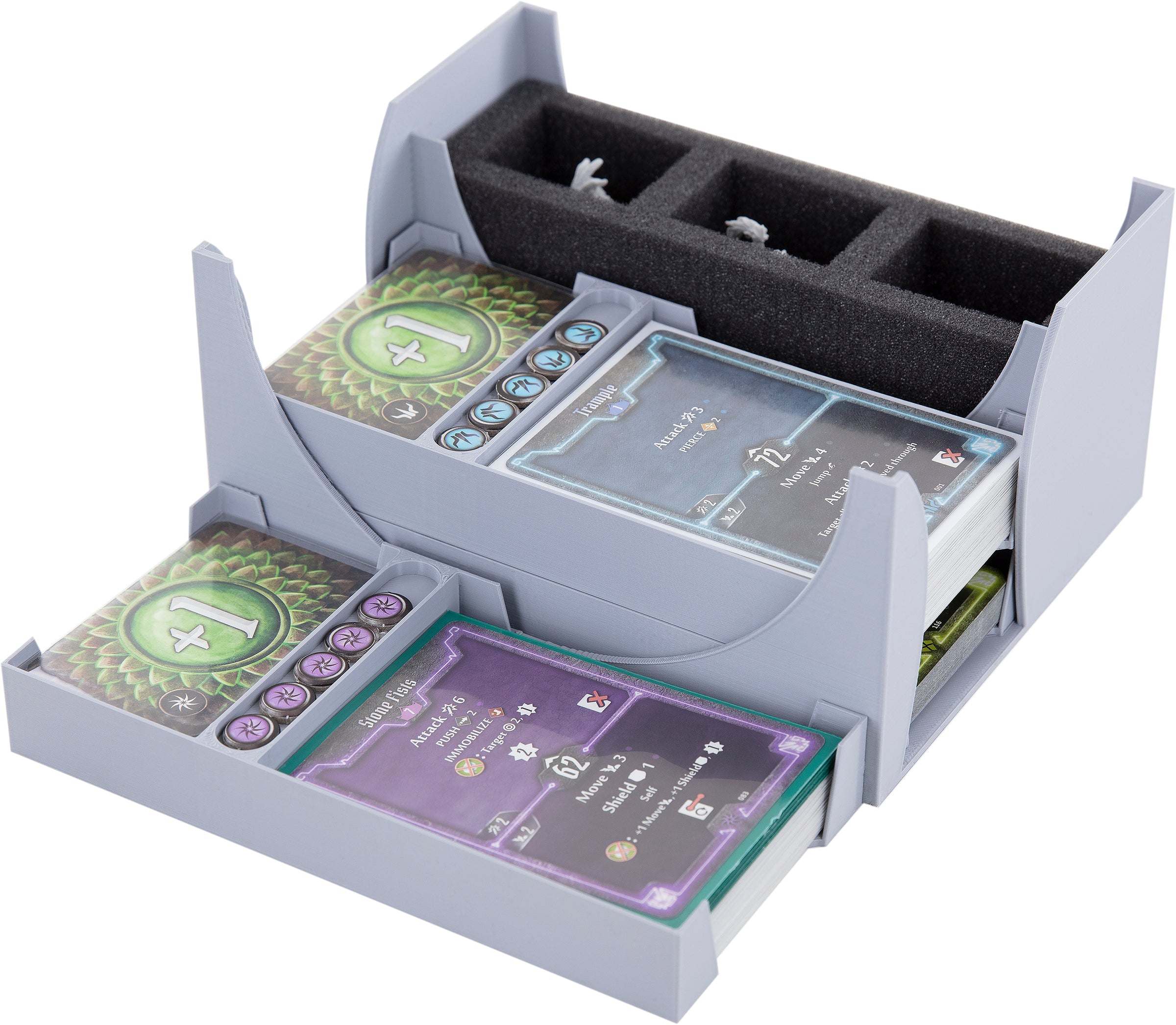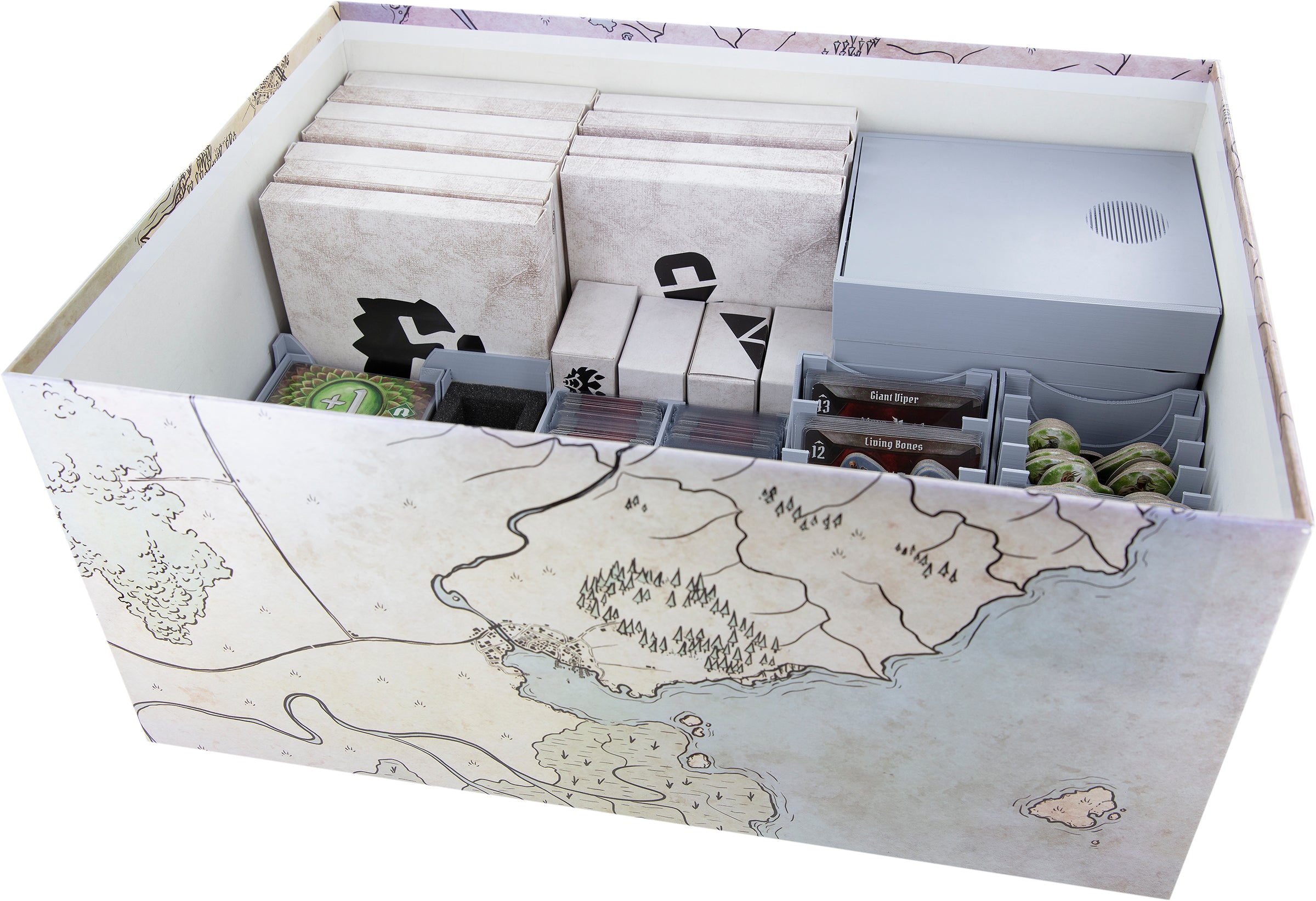 - Provides space for all miniatures and game components from the "Gloomhaven" core game.