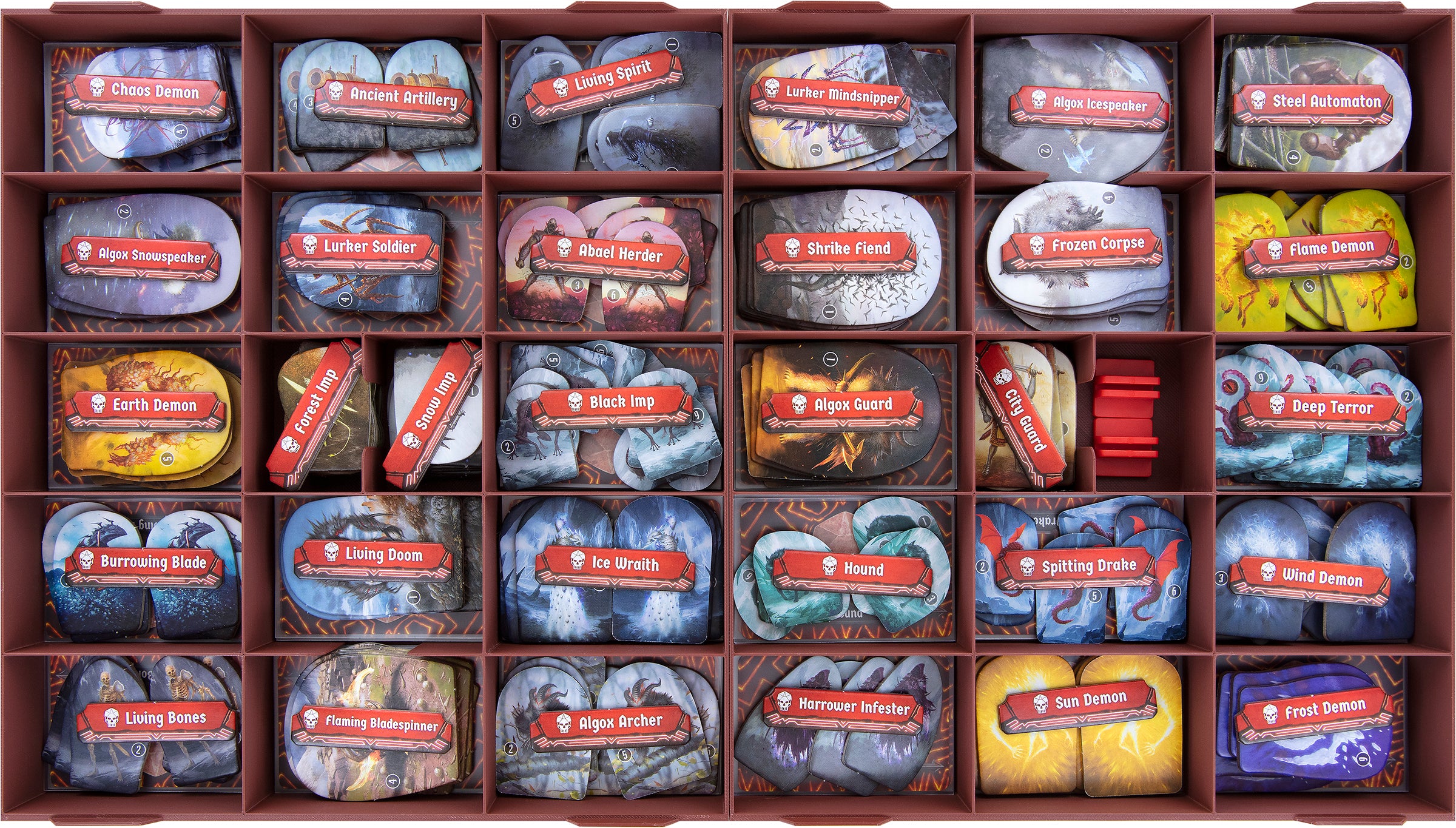 Plow through snow and ice instead of digging through 14 kg of game material. We organize your board game box for you. 8 card holders, 8 token trays, and 6 Tuck Box inserts ensure orderly game components. Identically colored trays create a clear structure and save you time when sorting. This way, you always know where your tokens, cards, and monster standees are.
