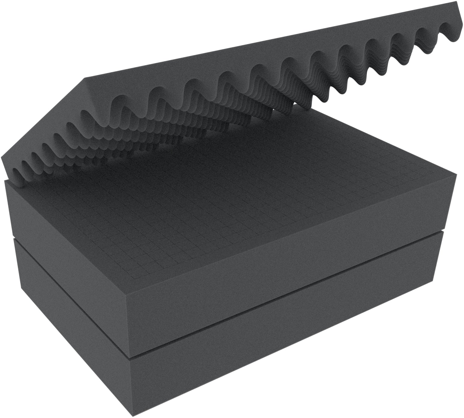 With a combined height of 180 mm, the two grid inlays offer plenty of space for sensitive goods to be transported. The grid in the foam material allows individual adaptation of the foam inserts to all shapes. It is ideally suited as protection for the transport of various industrial goods such as medical equipment, tooling components or technical devices. The grid foam is perforated with a grid of 20 mm x 20 mm x 90 mm in height, as well as with a surrounding edge.