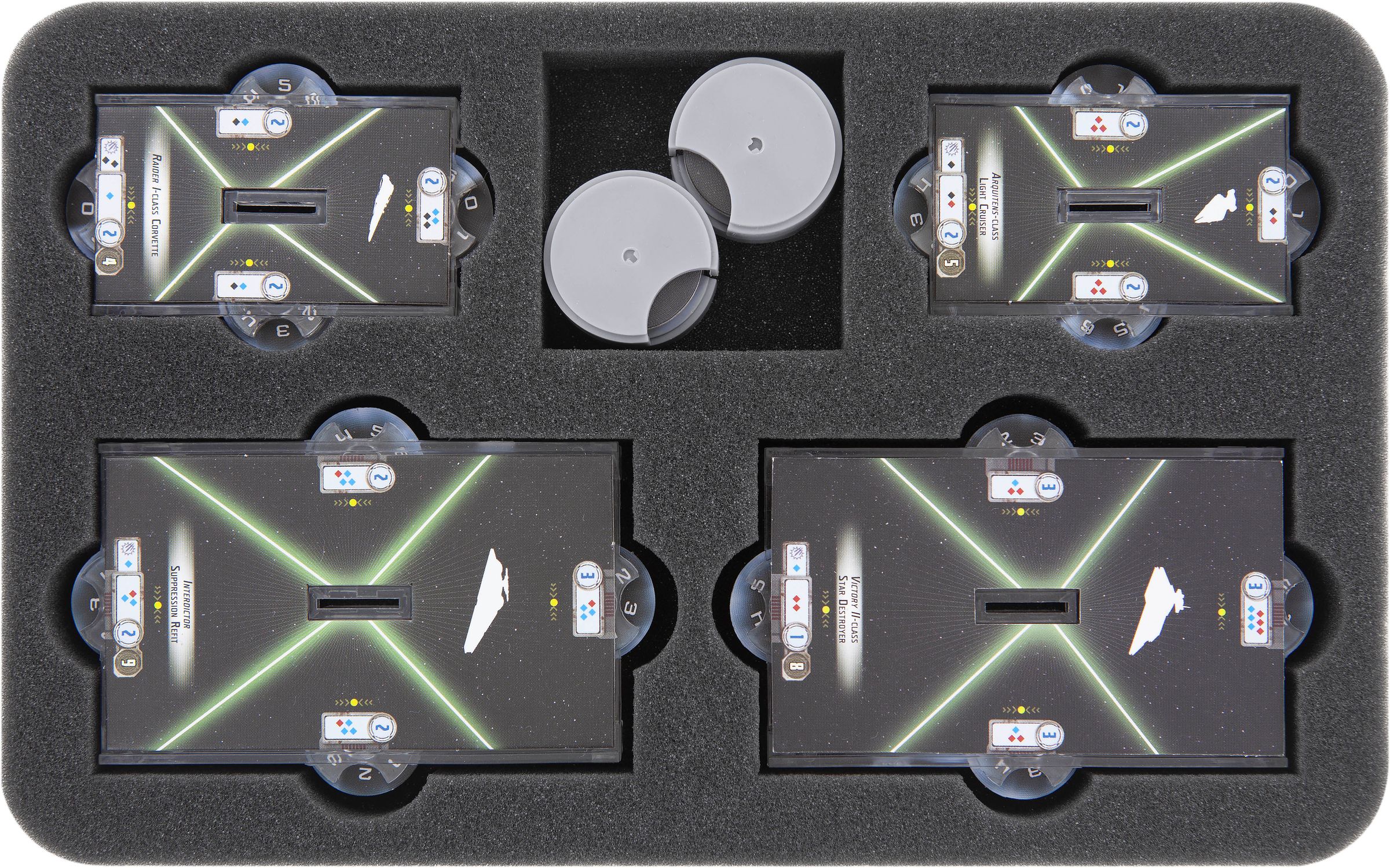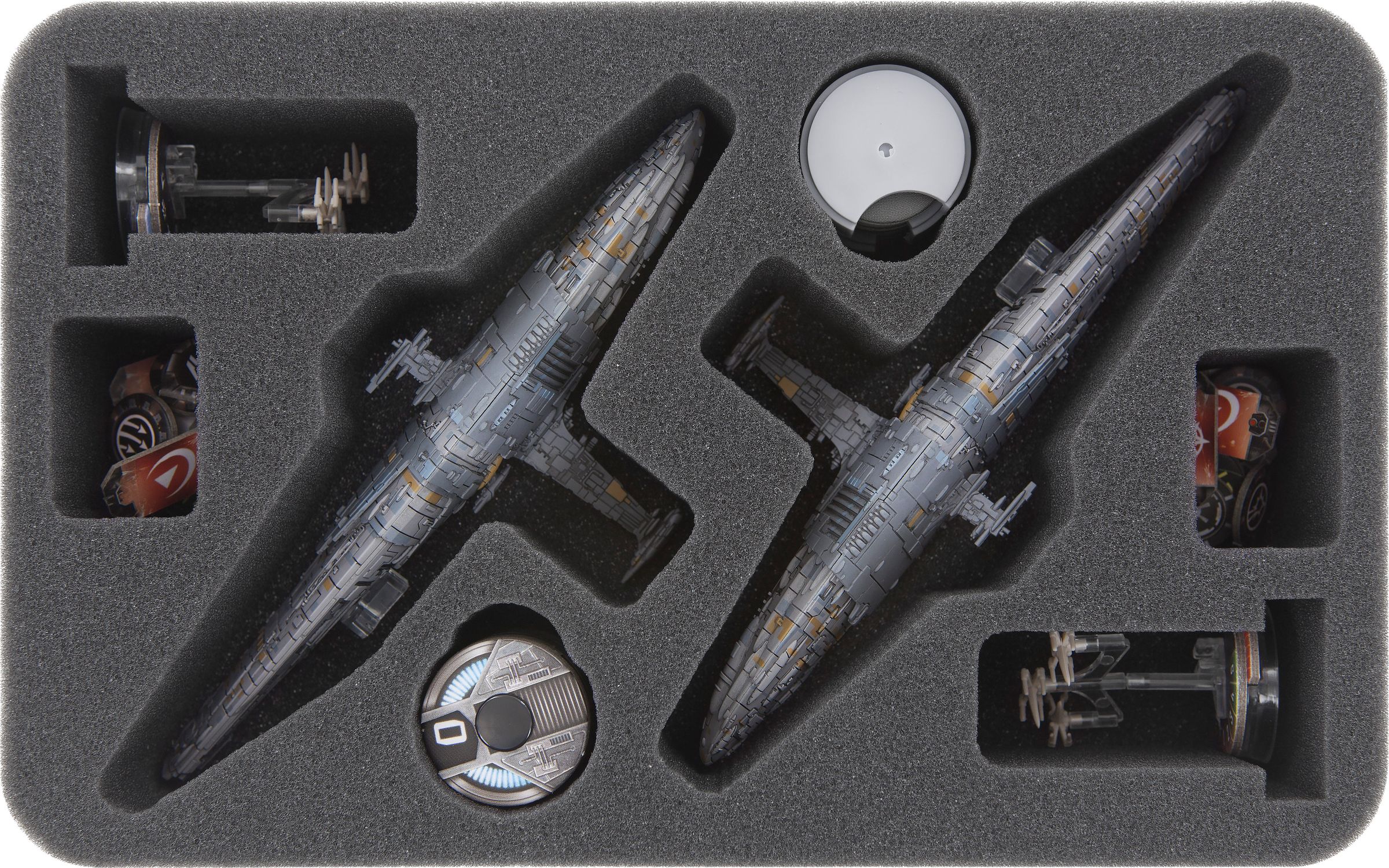 - 1 foam tray with 15 compartments for 1 Interdictor, 1 Gladiator-class Star Destroyer, 1 Imperial Light Carrier, 1 Imperial Light Cruiser, bases, (sleeved) cars, tokens, speed- and command dials (FSKQ045BO)