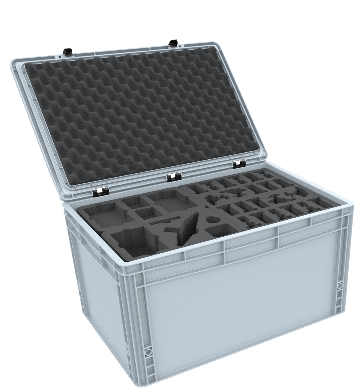 Of course, the foam trays fit exactly into the stable Euro container from AUER Packaging. The Euro container is easy to lock thanks to the practical hinge closure. Your miniatures are thus optimally protected against transport damages.