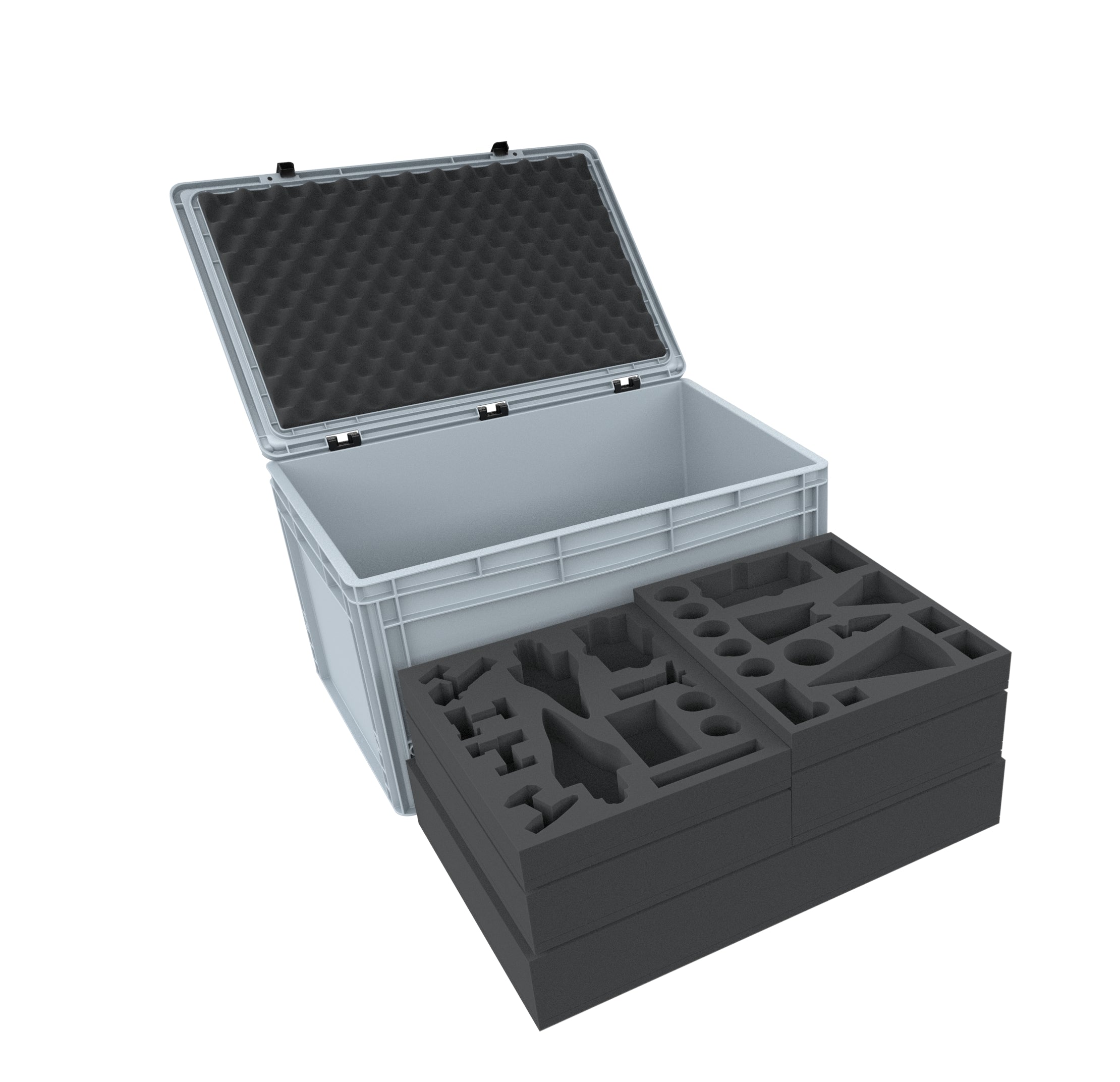 A third, smaller foam base serves to level the tray stacks in the Euro container.