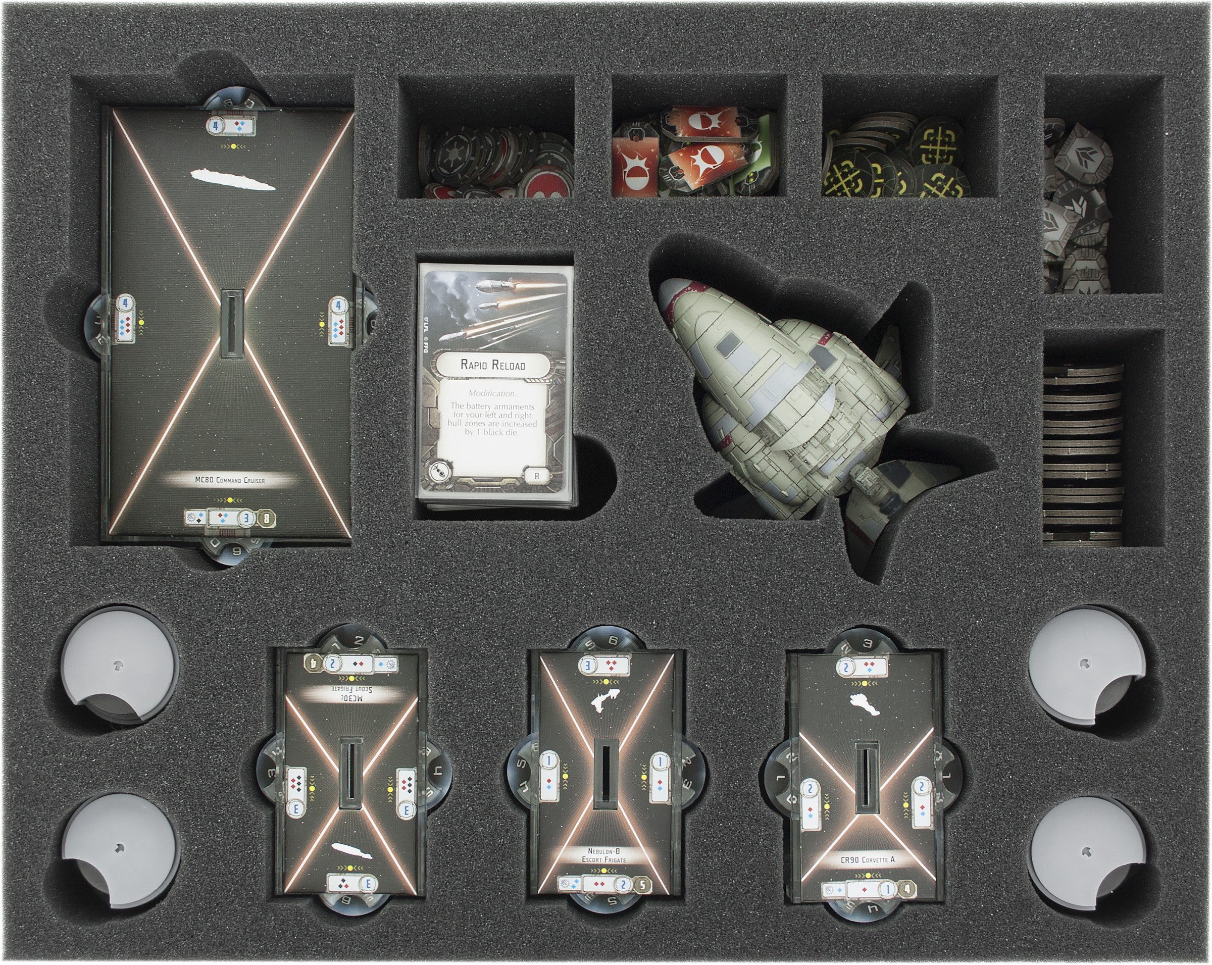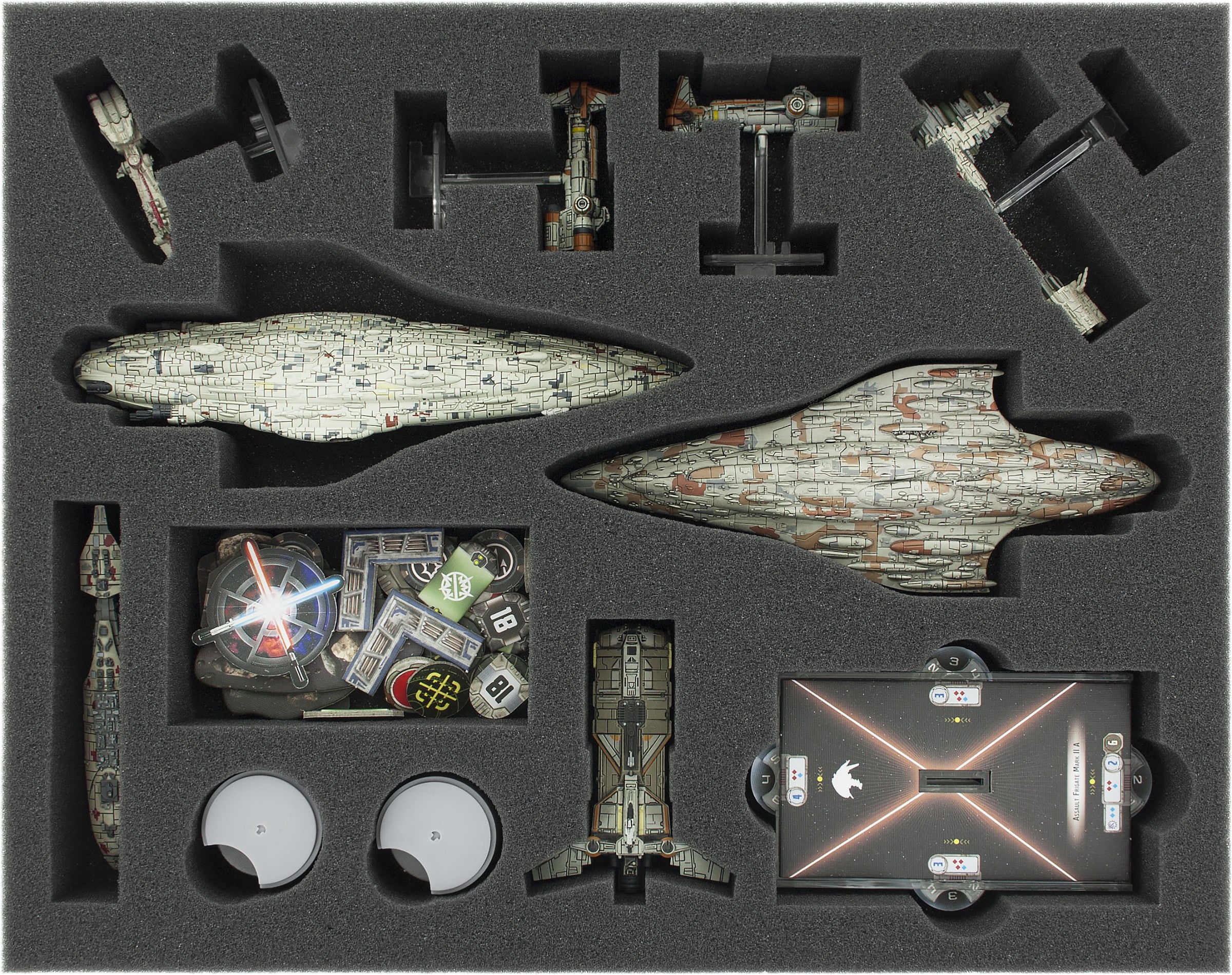 - 1 foam tray with 12 compartments for 2 2 MC80 Assault Carrier and/or MC80 Battle Cruiser, 1 Nebulon-B Escort Frigate, 1 Nebulon-B Support Refit, 1 Phoenix Home, 1 MC30c-Torpedo Frigate or MC30c Scout Frigate, 2 Hammerhead-Corvettes, bases, speed- and command dials (FSKS045BO)