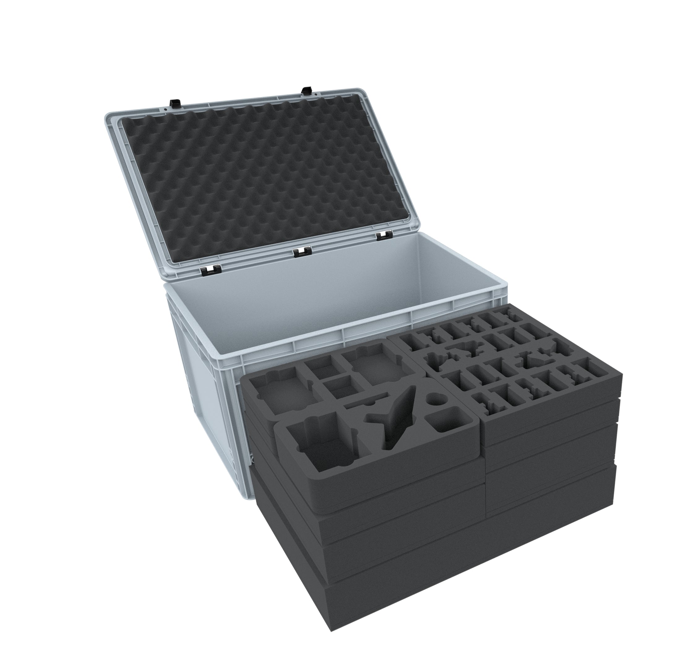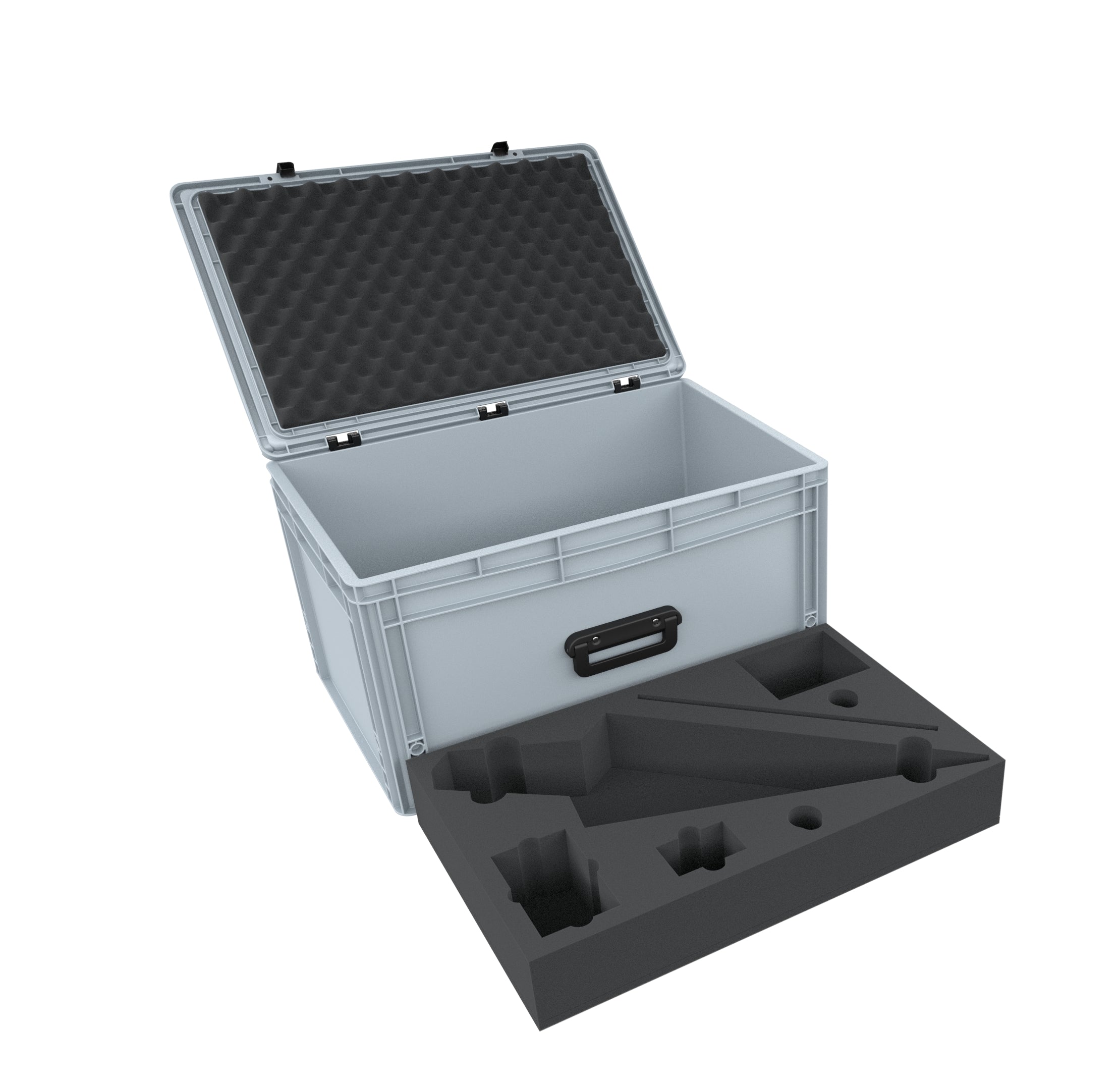 Of course, the foam trays fit exactly into the stable Euro container. The Euro container has practical handles that enable it to be carried safely and comfortably – even if the contents are heavy. To secure your models, the lid can be locked with two hinges and two snap locks.