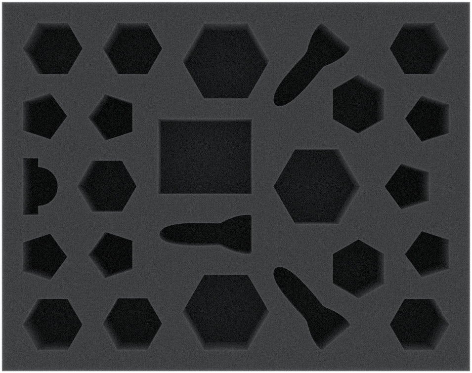 Each of the four identical foam trays has enough compartments to sort all 92 figures and the Victory Point Markers by color. The miniature-exact cut helps you to sort them. In the rectangular compartment, you can store the colored Balls, Dice, Special Token, and Discs. The soft, fine-pored foam protects the detailed miniatures reliably from damage even during transport. Also, the precisely fitting cut prevents them from slipping around or bumping into each other. When you have painted your miniatures, you can be sure that the soft foam protects the colors from abrasion and annoying scratches.