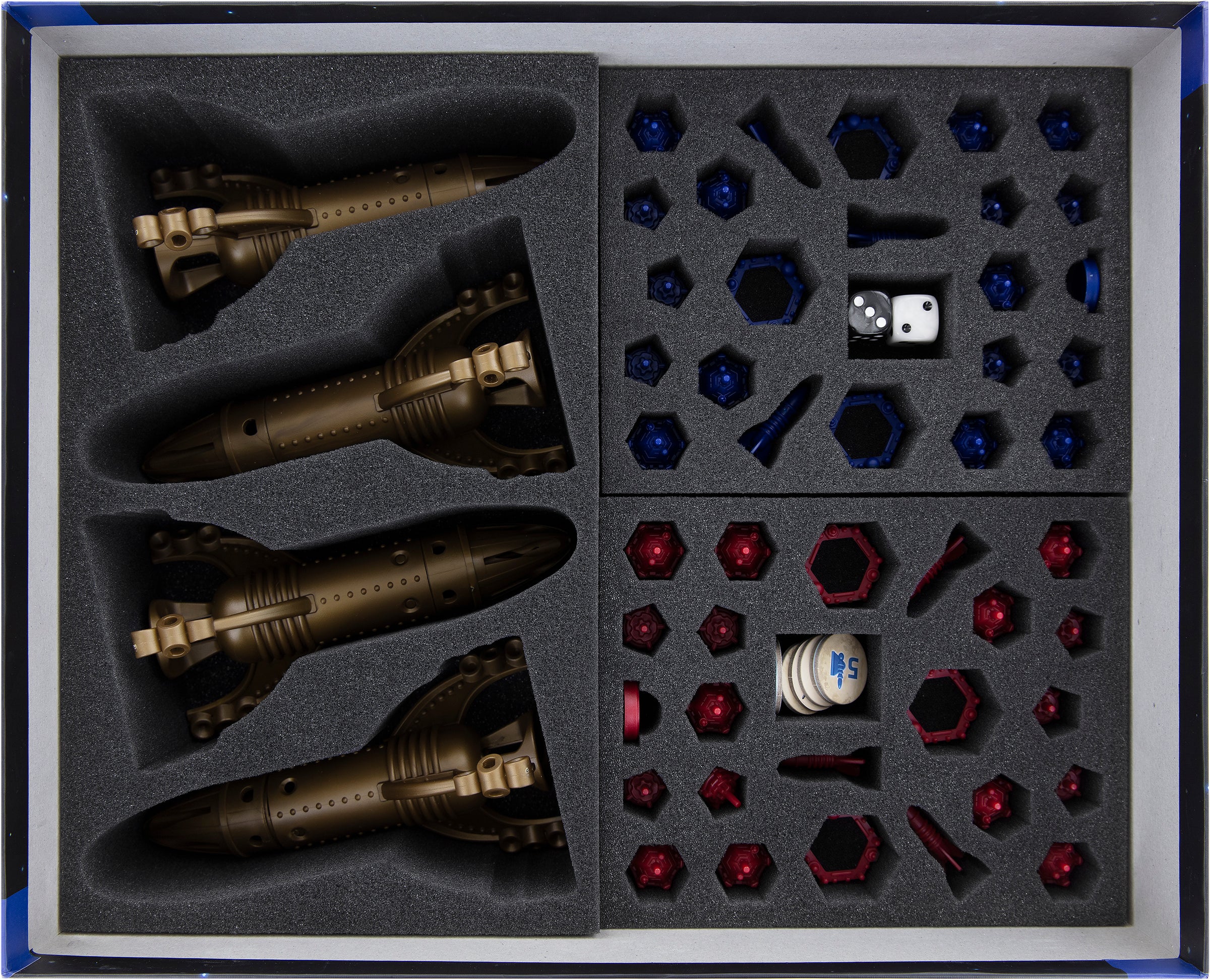 Place the Mothership insert and the player trays inside the box. On top of the player trays, you place the fitting foam mat. Put the Sectors and the Friendship Cards on the foam mat. Then cover everything with the supplied foam topper. This way nothing slips. Your miniatures are well protected from all sides.