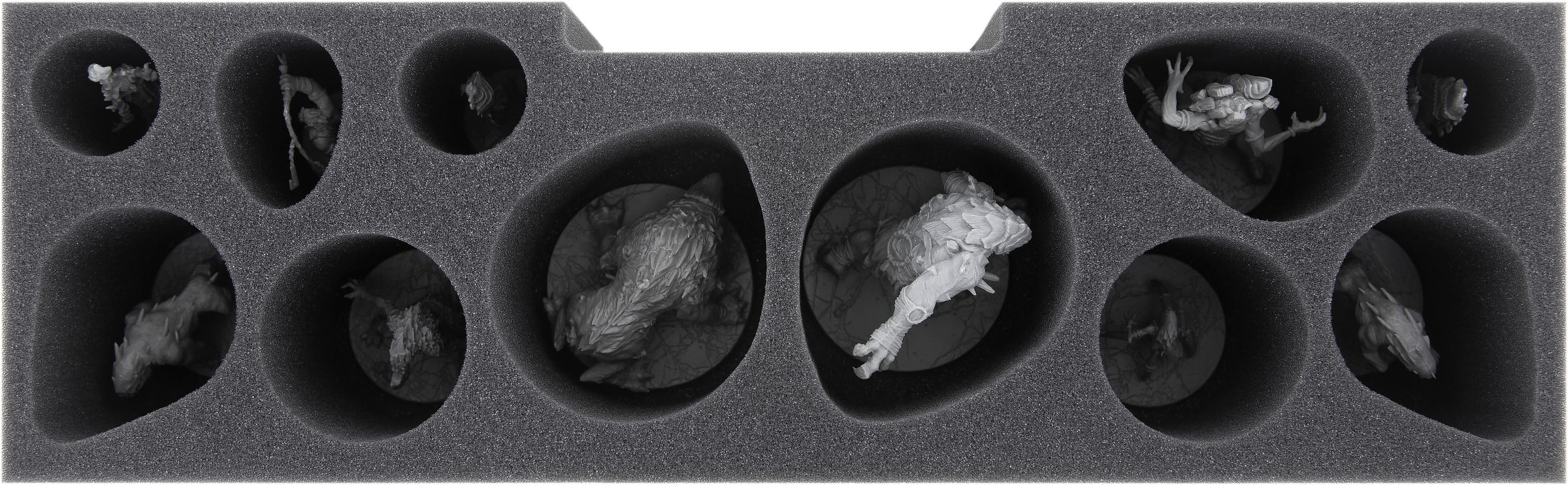 The foam tray with the 34 compartments is placed upon the plastic-insert and provides space for 14 smaller miniatures like Troglodytes and 10 medium-sized miniatures like e. g. Brood Mother. The compartments for the medium-sized miniatures are tailor-made. The remaining compartments of the tray will hold the (sleeved) cards, tokens and dice.