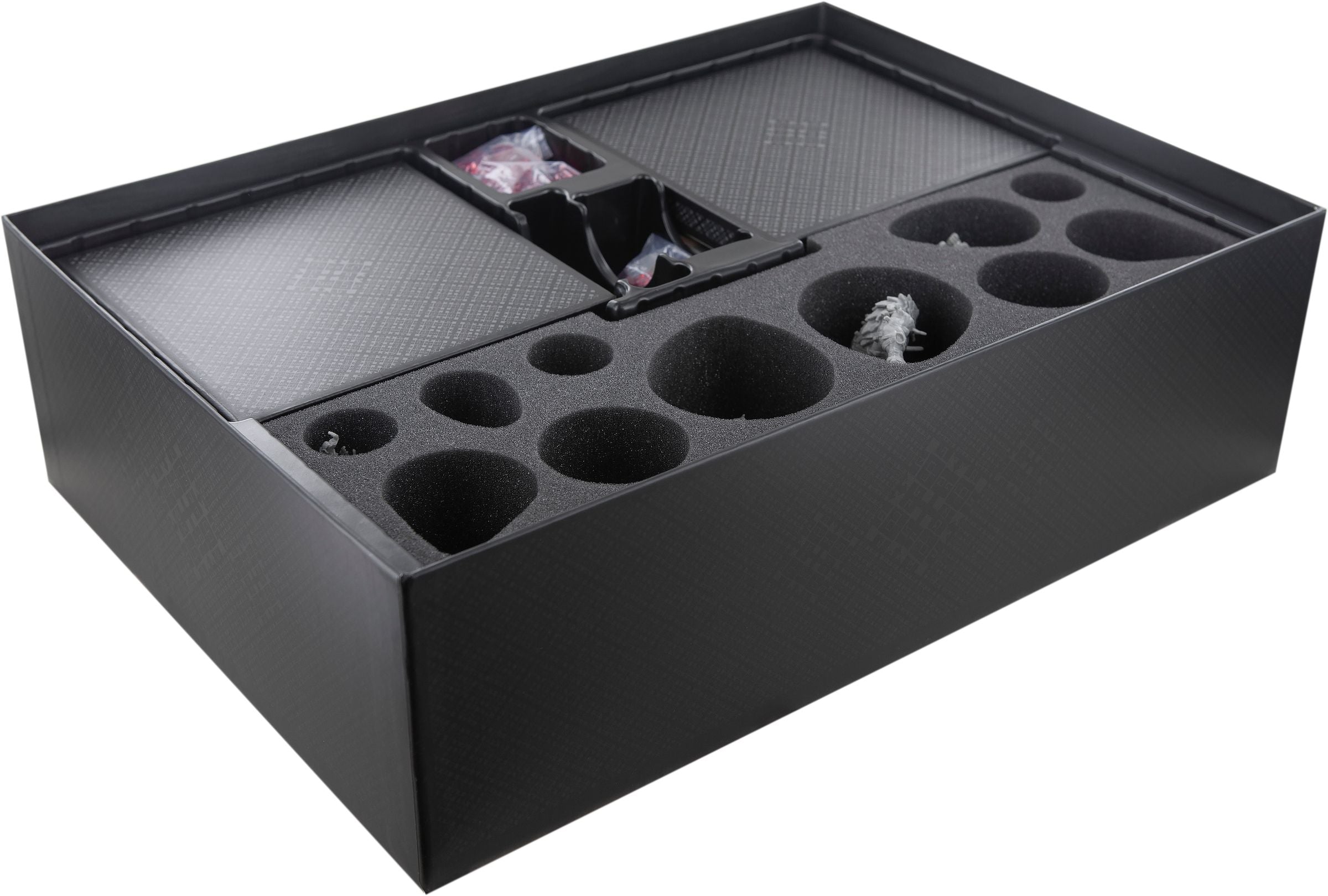 The first foam tray has 11 custom compartments for medium-sized and large miniatures like e. g. The Scourge and Cerberus. This tray fits exactly into the plastic-insert of the original game box.