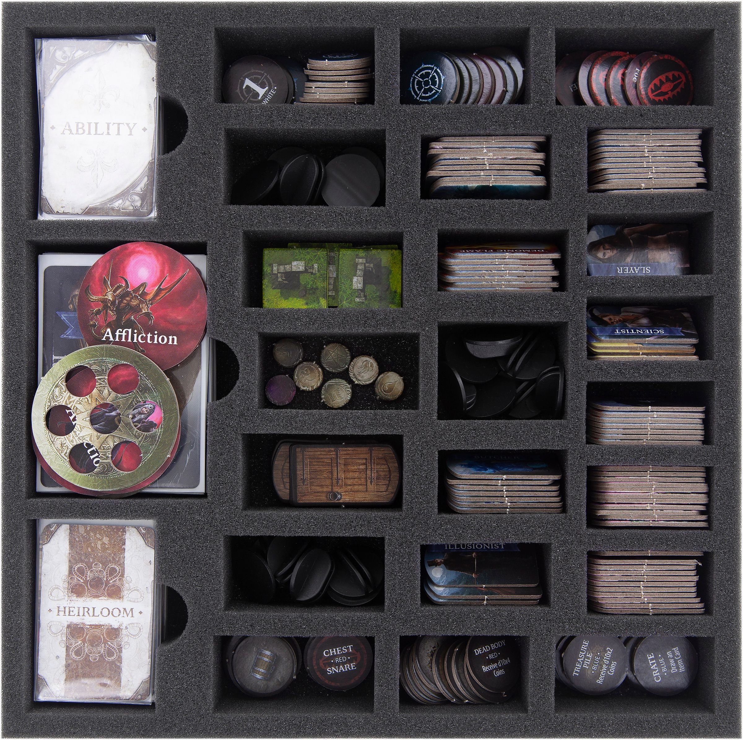 • 22 compartments for your tokens, three compartments for sleeved or unsleeved cards. The crystal clear organization allows a speedy Setup and Take-down.