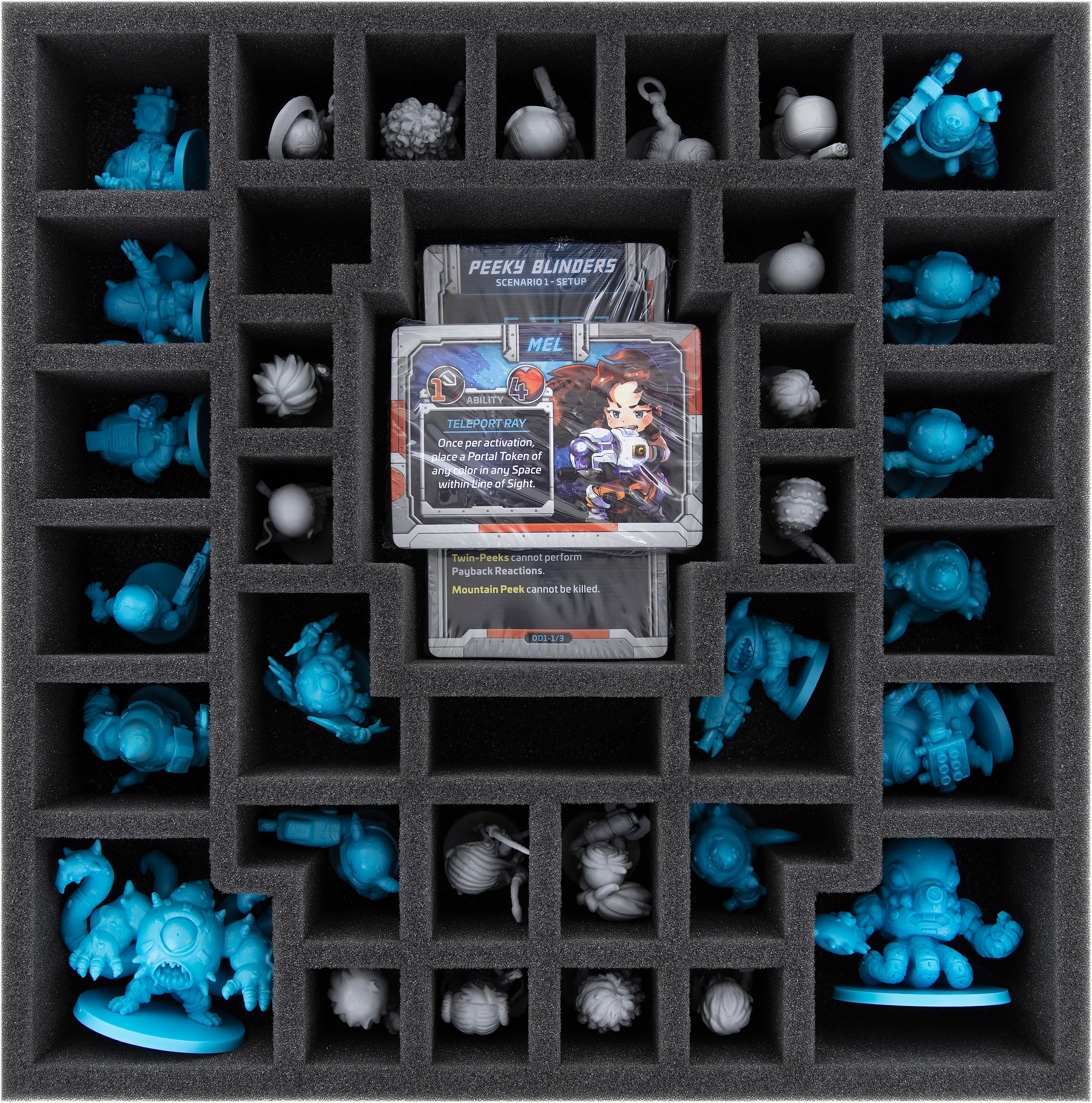 - Provides space for all 32 miniatures and the cards from the box. All cards also fit with sleeves. The Plastic Dashboard Trays and the Campaign Sheet Pad can be placed on the foam topper.