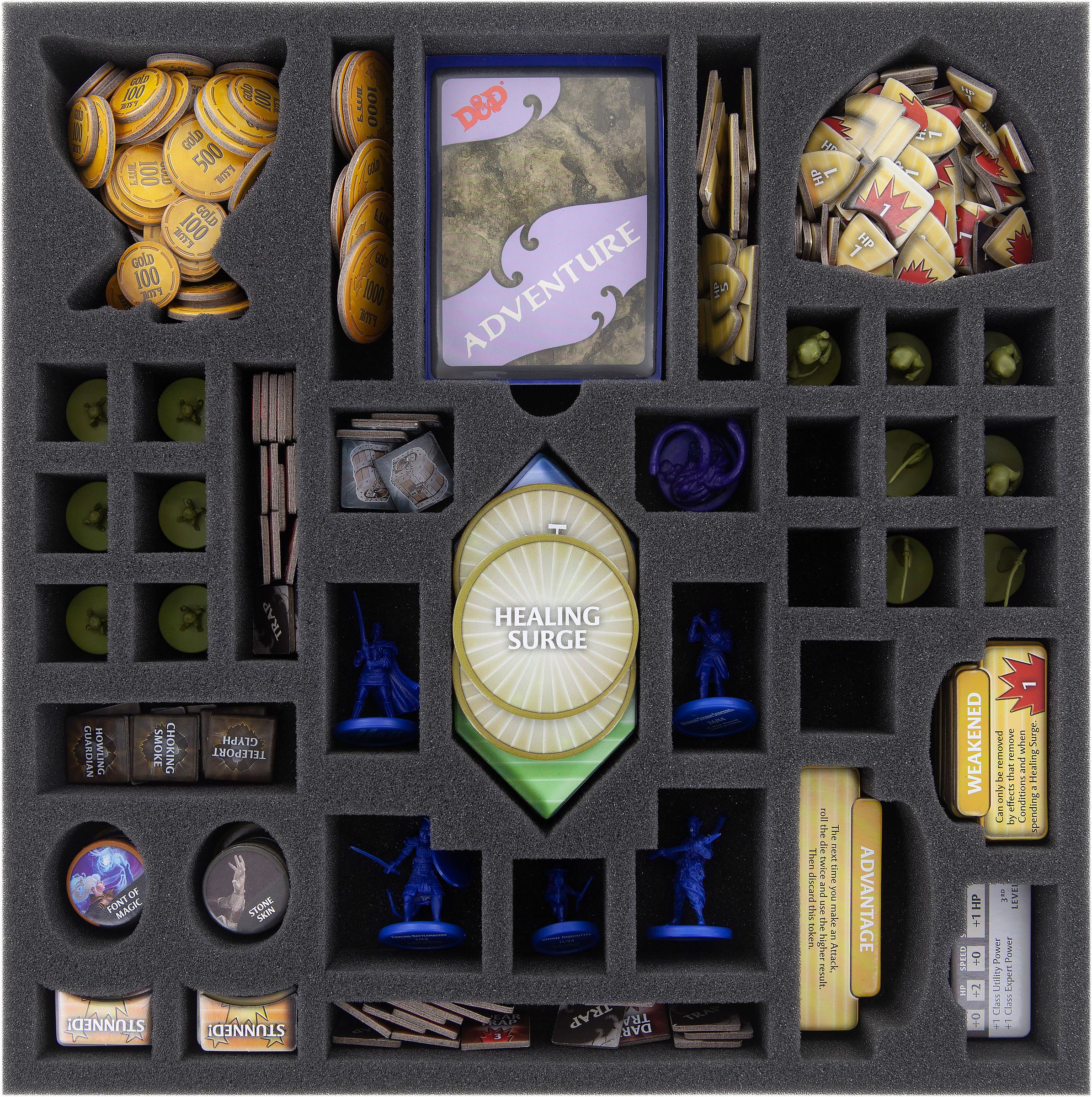 • Provides space for all 42 miniatures and all accessories. The larger cardboard parts - the Hero, Villain and Dungeon tiles, as well as the booklets - lie separately upon the topper (see photograph).