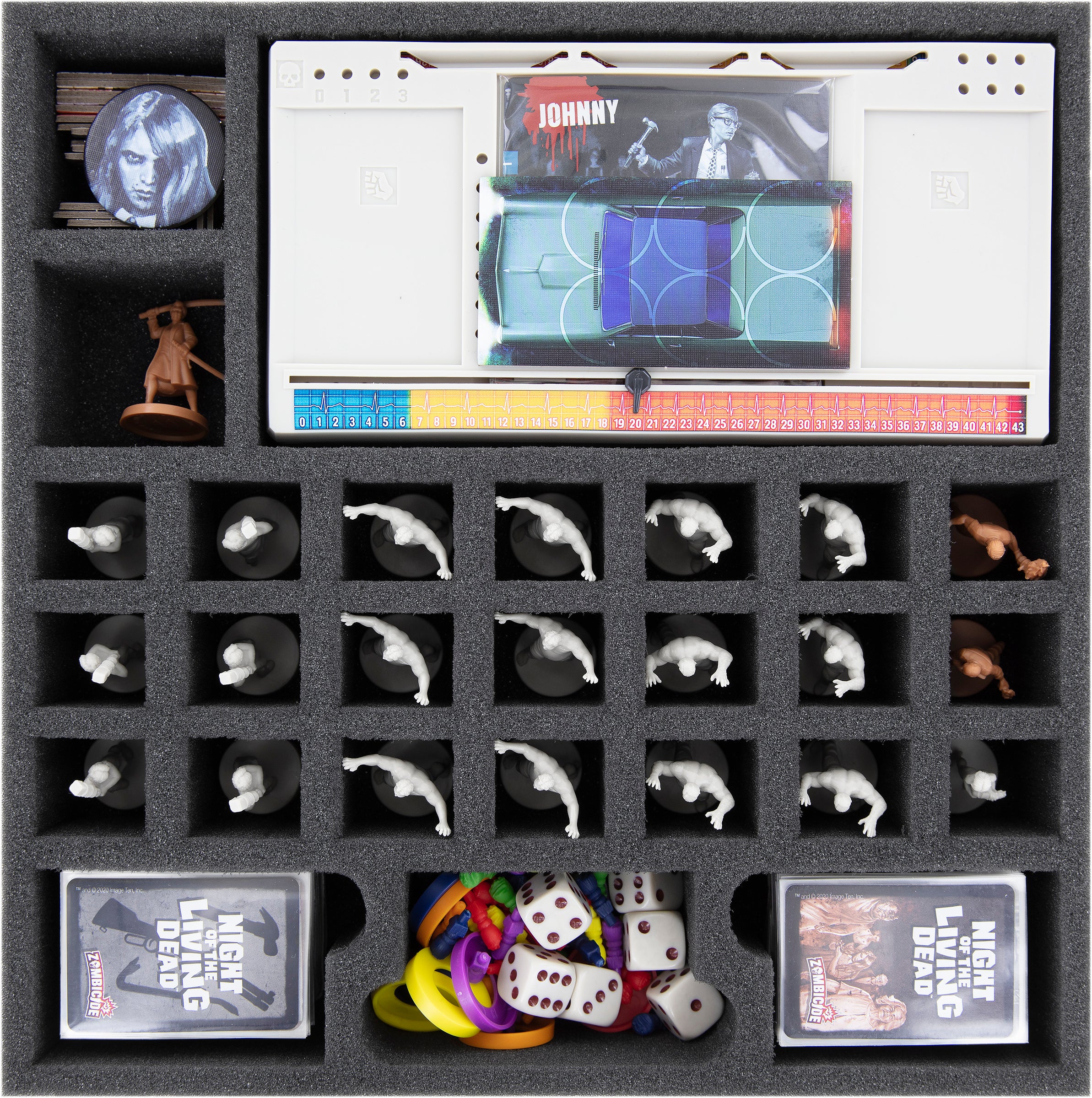 - If you want to store the 10 promo miniatures from the Kickstarter campaign ("Dead of Night" box) in this foam set as well, just put the dice together with the tokens and the colored bases in the large compartment between the playing cards. This gives you 2 free compartments on this insert and 8 free compartments on the other insert.