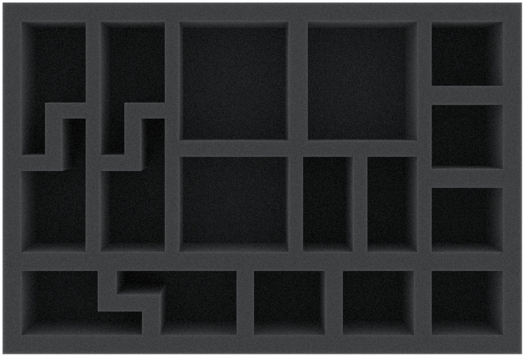 Three foam inserts are included to stow your miniatures. Thanks to the custom-fit cut, the models have a tight fit, and should it also go over the glaciers of the north during transport, the figures remain in place. The soft, fine-pored foam ensures that your models are well protected from damage. Even painted models are safe here, and scratches and flaking paint are reliably prevented. You stash larger tokens and counter rings in the remaining compartments.