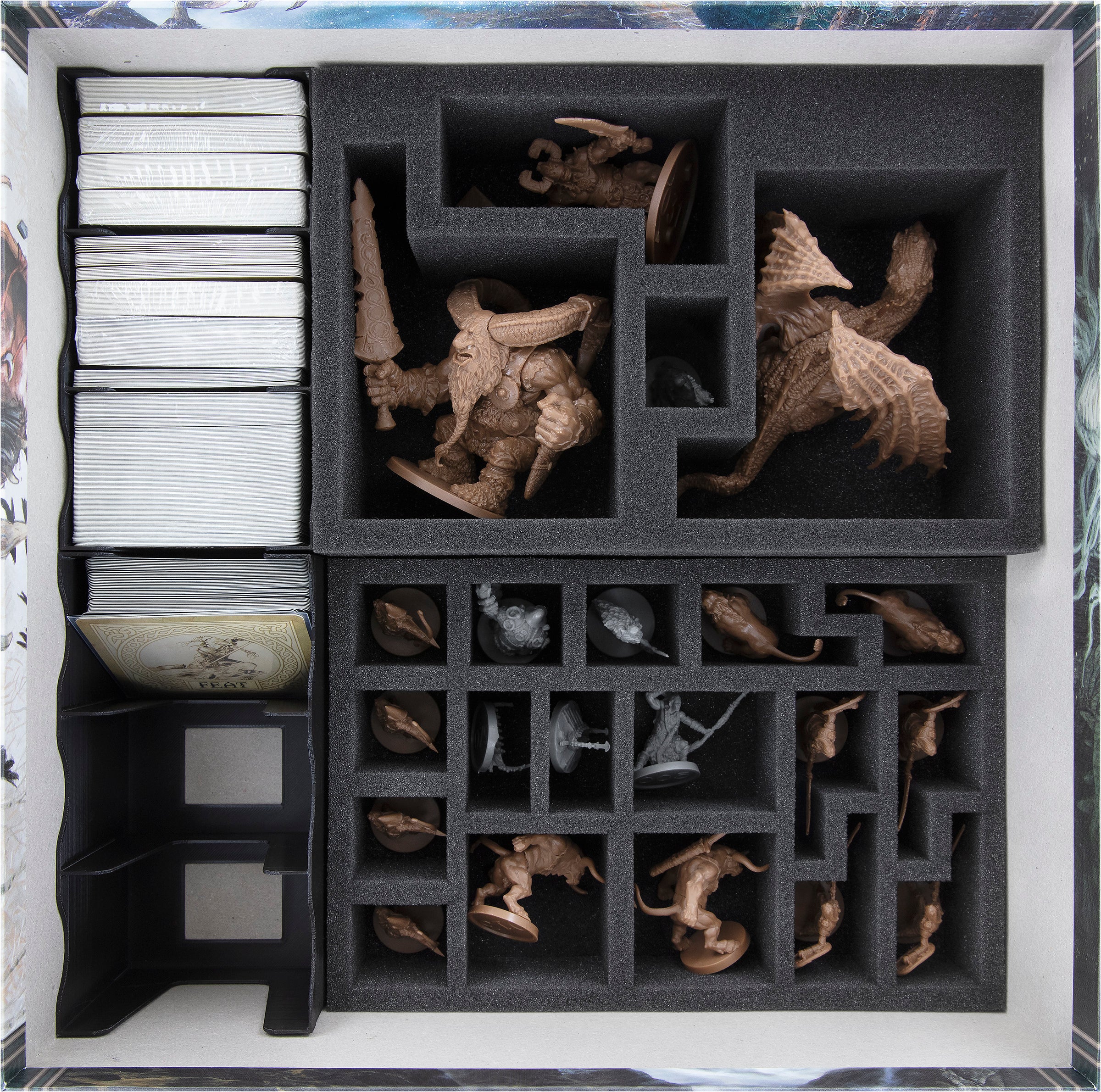 - 2 foam trays, each with 17 compartments for hero miniatures like Felerion, Briya, Lydana, Volger, Maelling + enemy miniatures like Bull Trolls, Garms, Forest Trolls, Draugrs + ships + small game material like counter bases, elite enemy tokens