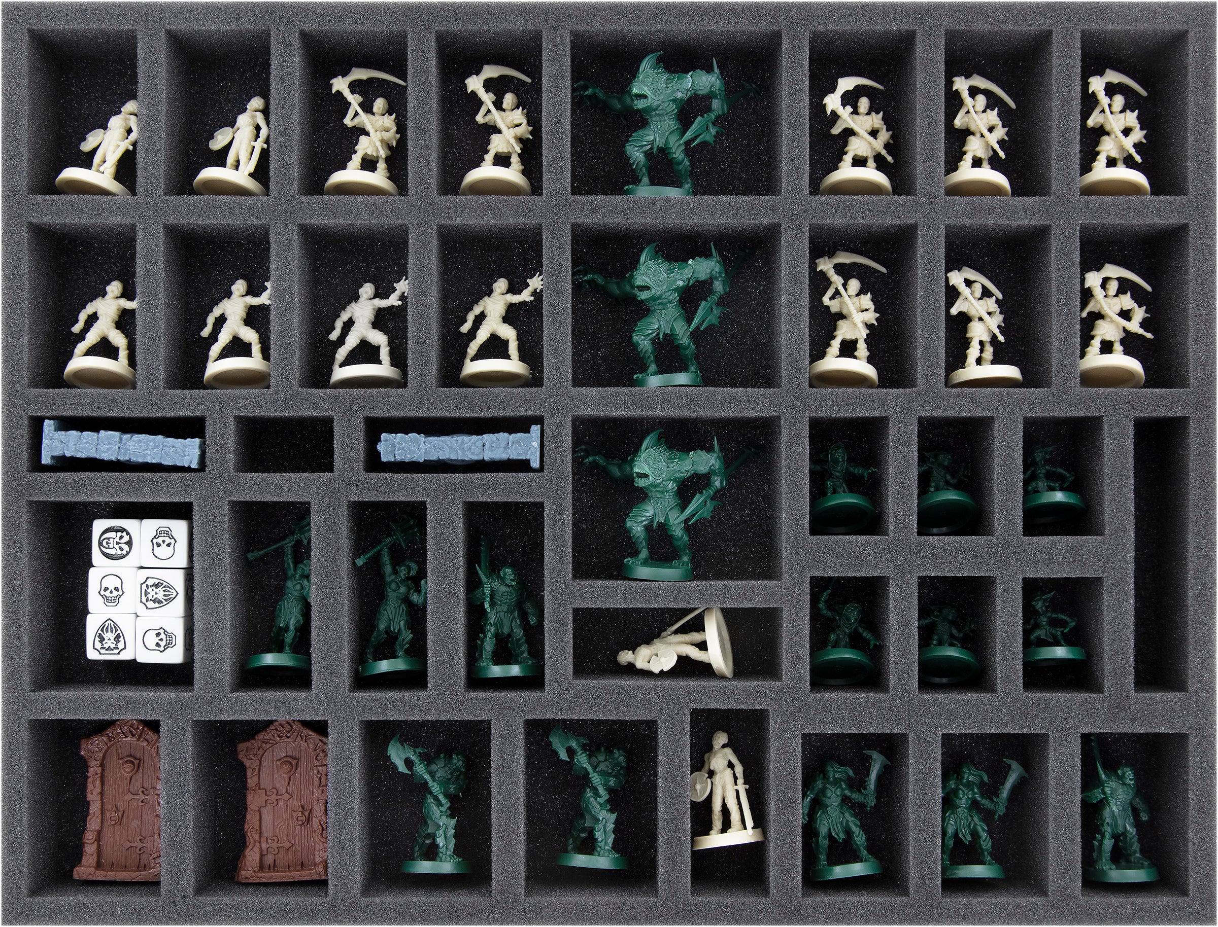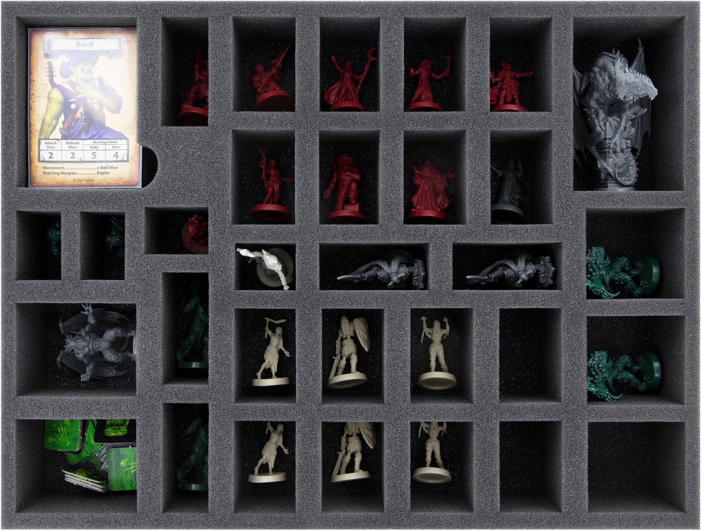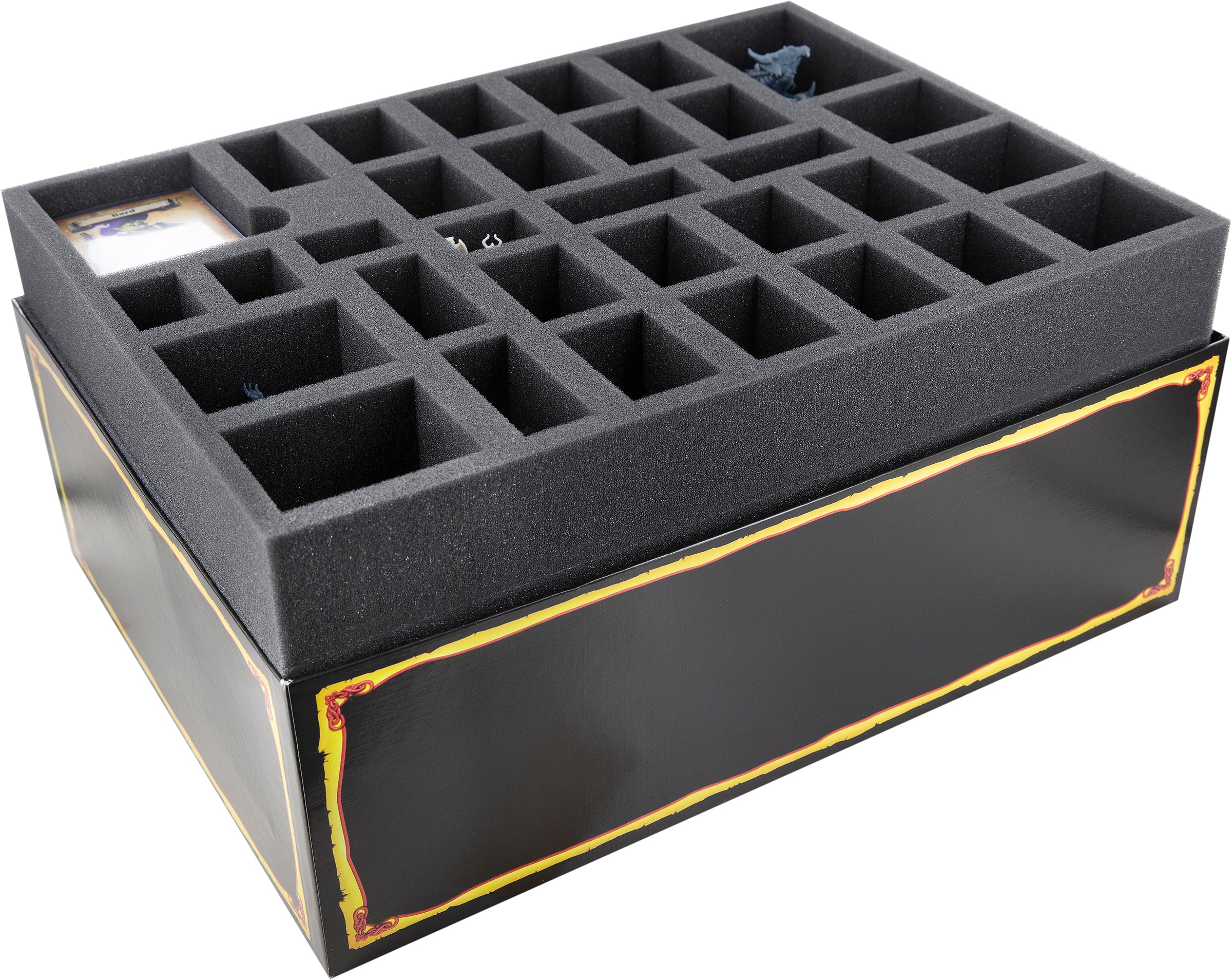 Whether it's the dwarf from the core game, the mummy from the expansion, or the bard from the Mythic Box - each miniature gets its own custom-fit compartment here. This way, your models stay safely in place during transport. The soft foam does not only protect the sensitive parts of your figures. The colors of painted miniatures are just as safe from abrasion and scratches.