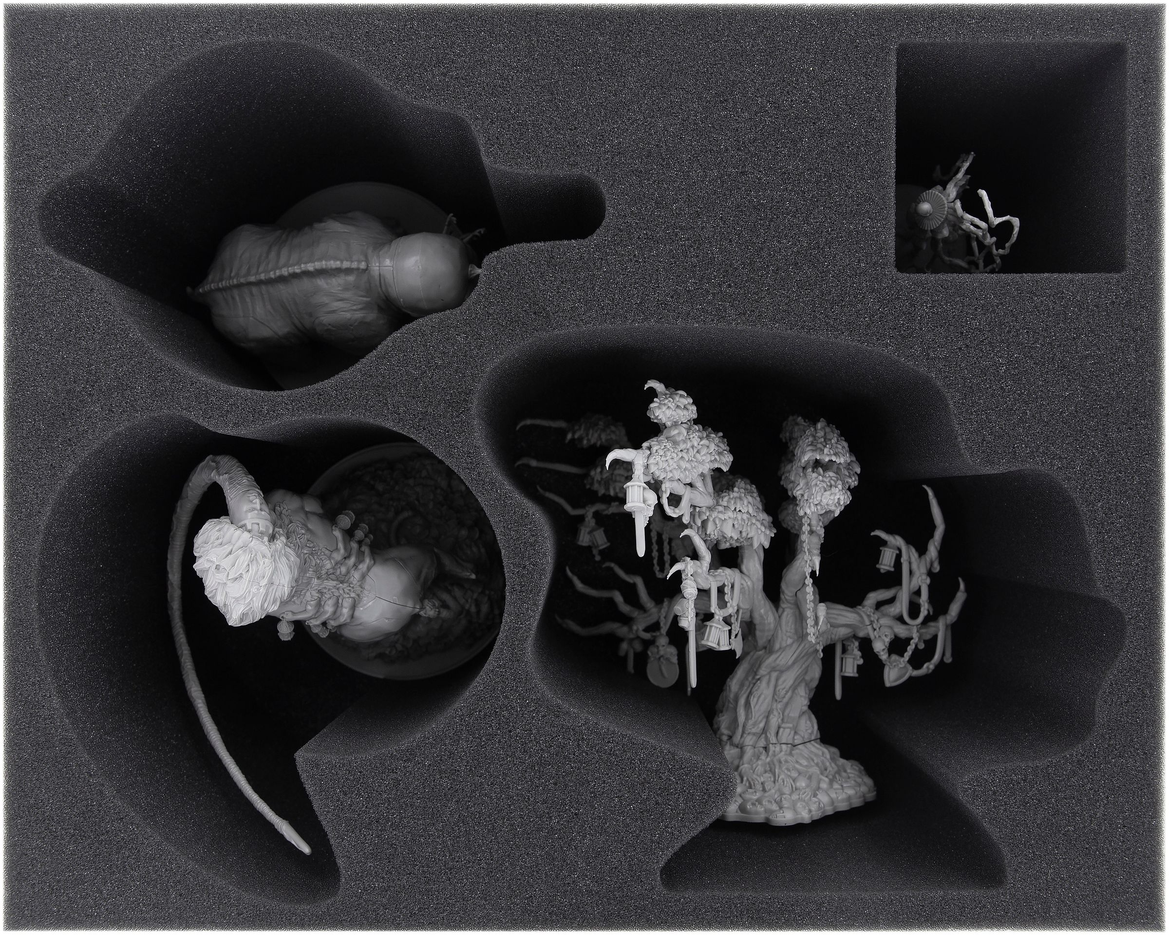 This foam tray for the Wave 2 of Kingdom Death: Monsters features 4 compartments for Lion God, Lonely Tree, Gorm and one additional small Mini like e.g. Slenderman. The high-quality foam ensures that the delicate features of your precious minis are safe at all times. Also, if you painted the minis, the color is well protected from getting damaged.
