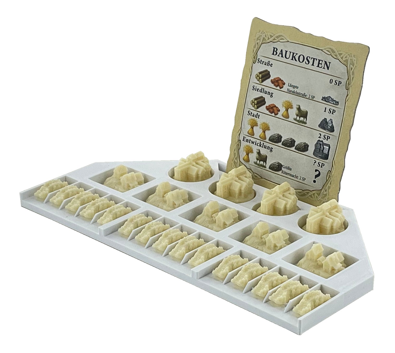 Cities, settlements, and roads are important to your success in Catan. Sprawling on the table, you may lose sight of the small miniatures. And then, at a crucial moment, you have none at hand.