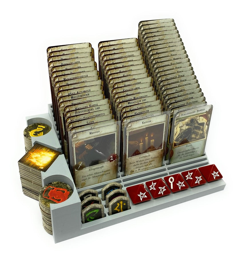 - Tray 2 has 12 compartments for Horror cards, Damage cards, Condition cards and Spell cards, as well as 29 additional compartments for Person tokens, Secret Passage tokens, Barricade tokens, Wall tokens and Door tokens. Among them is a large compartment for the Clue tokens.