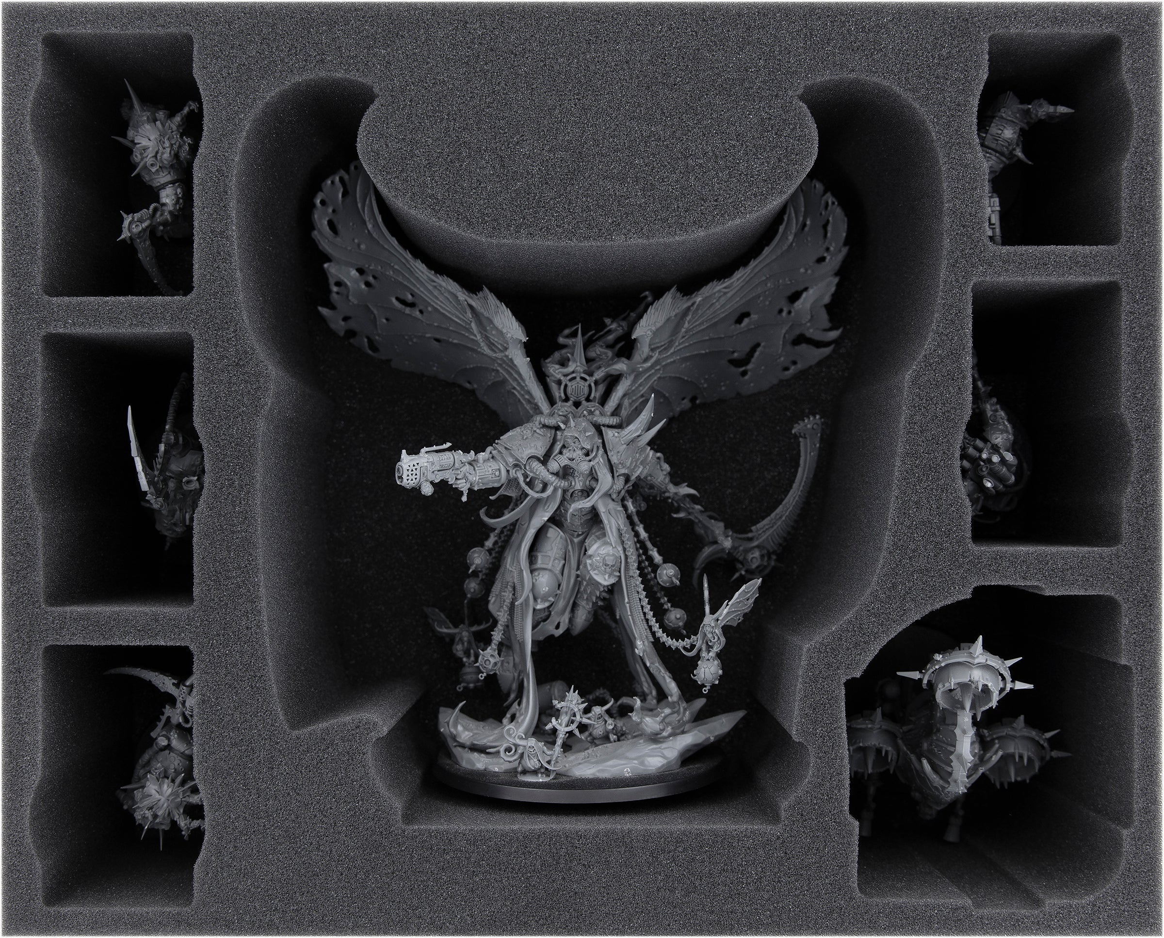 The large compartment of the FSMFAX120BO is suitable for both construction variants of the Mortarion, Daemon Primarch of Nurgle. It doesn’t matter whether your model swings the “Silence” scythe left or right. The Death Guard leader fits both poses into the insert.