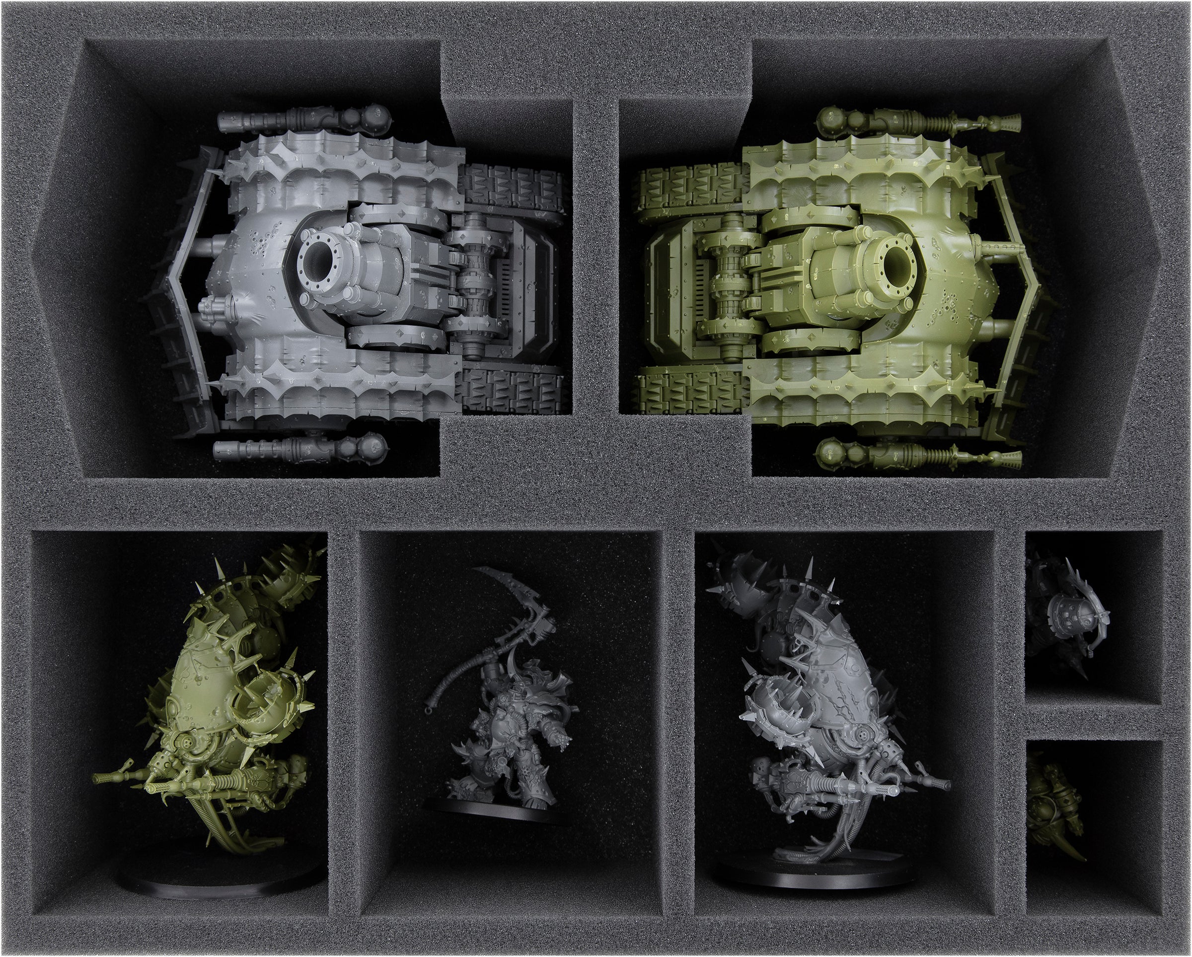 The FSMFGH090BO insert offers a safe place for two Death Guard siege tanks with custom-made compartments. Separate storage on the soft foam mat prevents sensitive parts such as the spikes on the tank and plow blade can be damaged.
