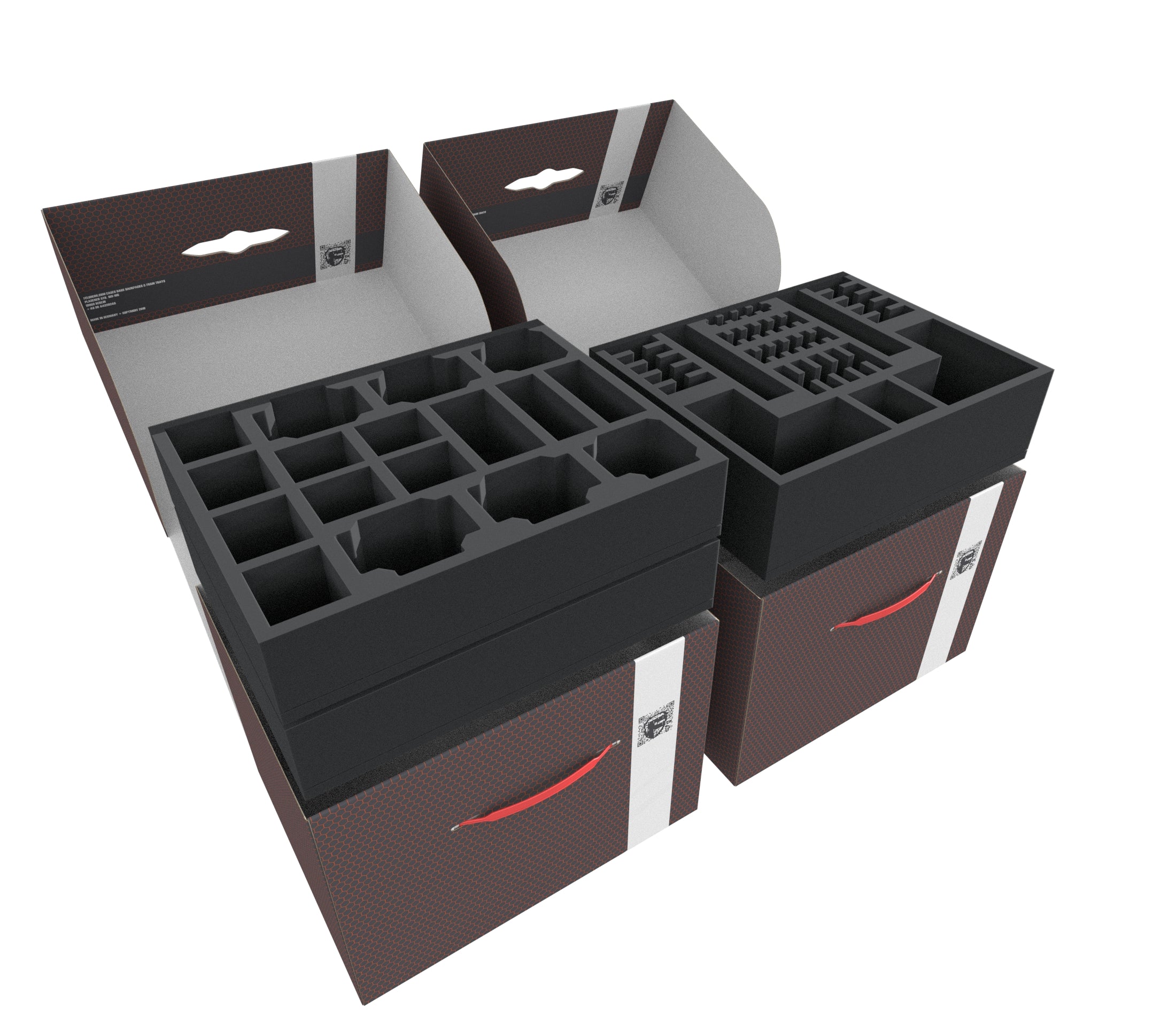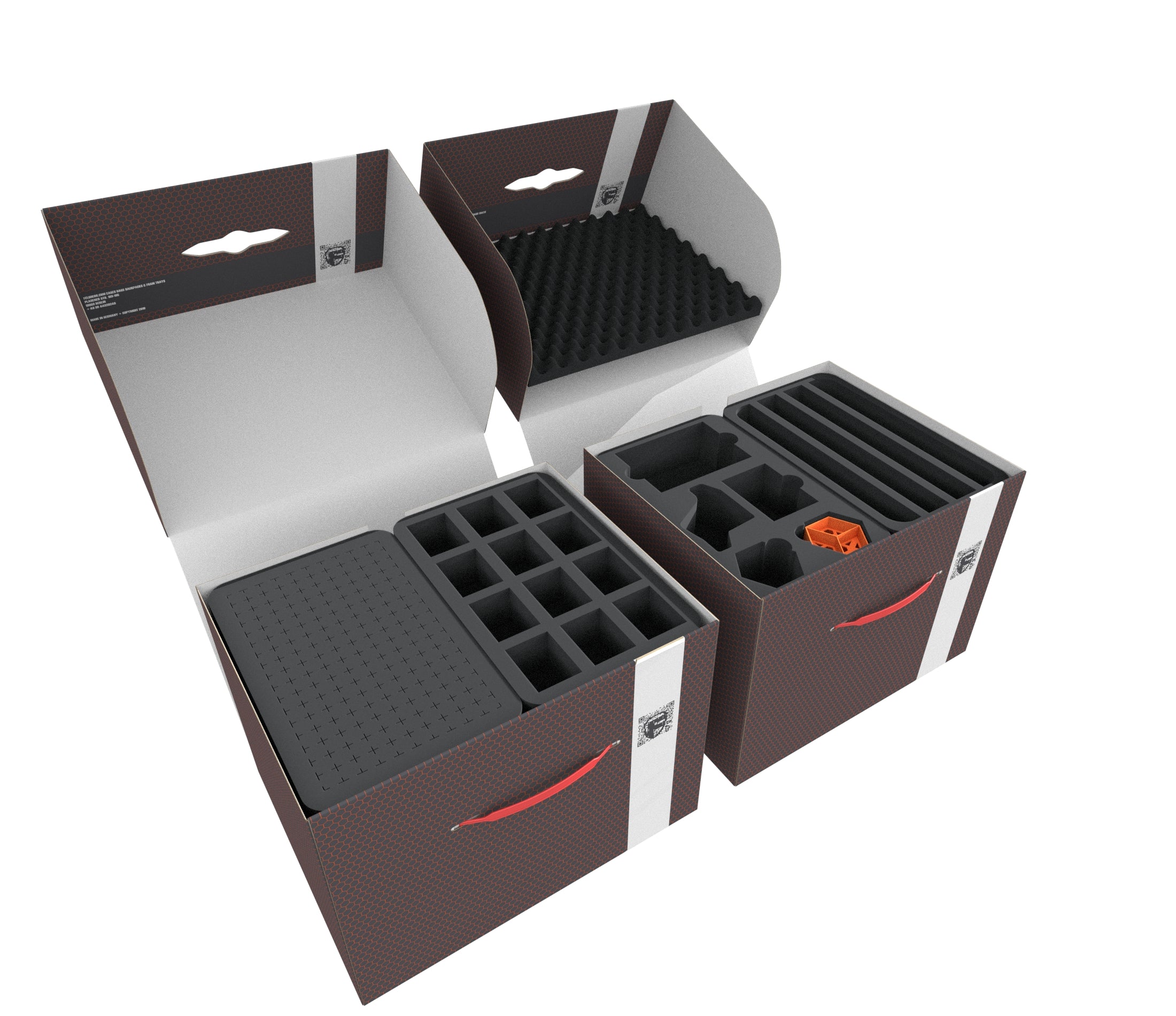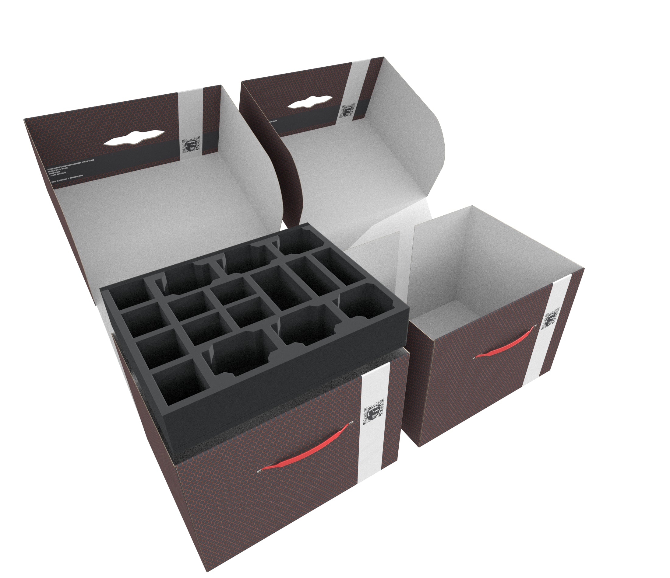 The Storage Box FSLB250 is made of coated, double-walled cardboard. This makes it not only pleasantly light but also particularly tear-resistant and stable. With the matching foam trays, miniatures and game material can be stored safely and dust-protected and can also be transported effortlessly with the plastic carrying handle.