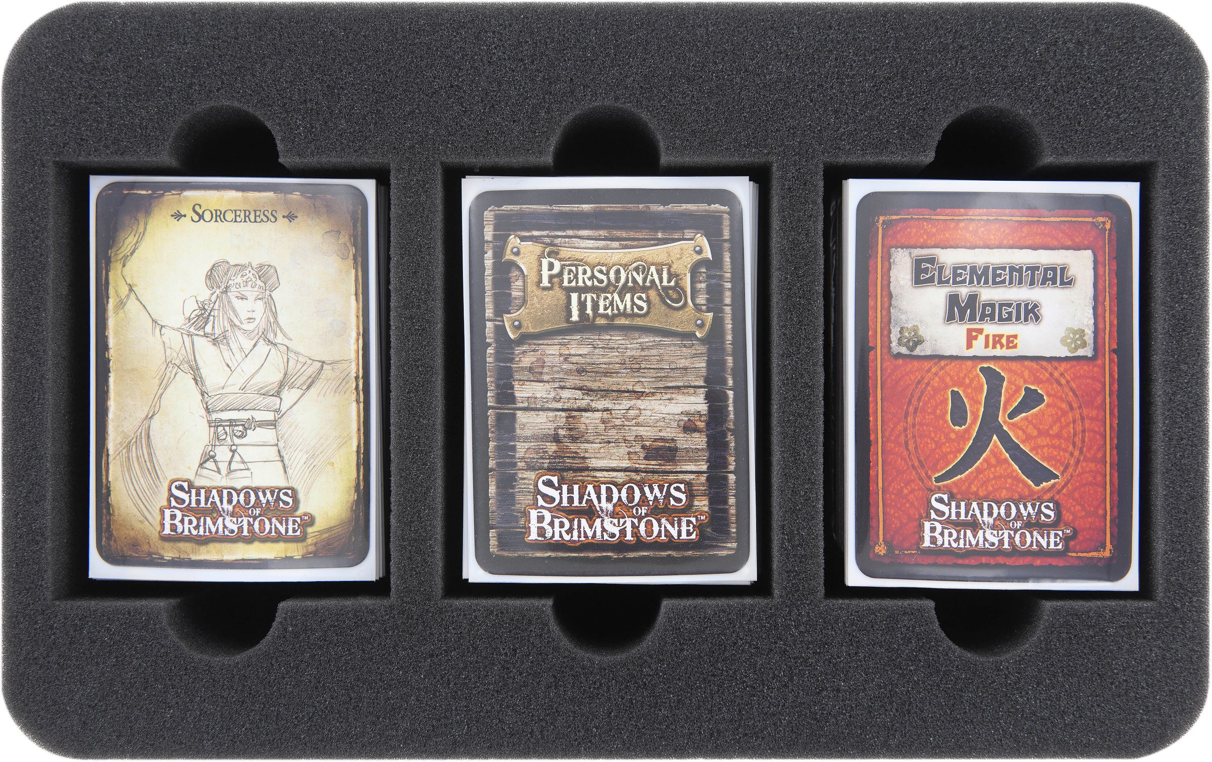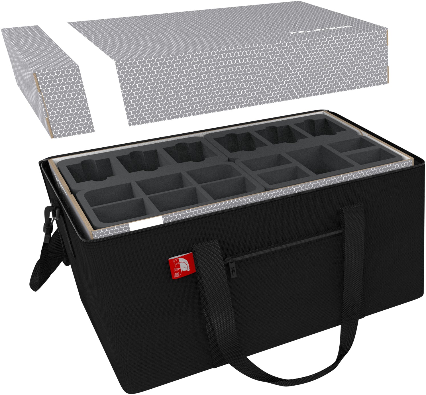 We would like to present you the Feldherr Transporter-Set for the board game "Forbidden Fortress" from the "Shadows of Brimstone" series. The set includes the practical Feldherr Transporter bag, a stable Double-Size Storage Box and the matching foam trays for all heroes, demons, monsters, (sleeved) cards, tokens, dice and many tiles of the core set.