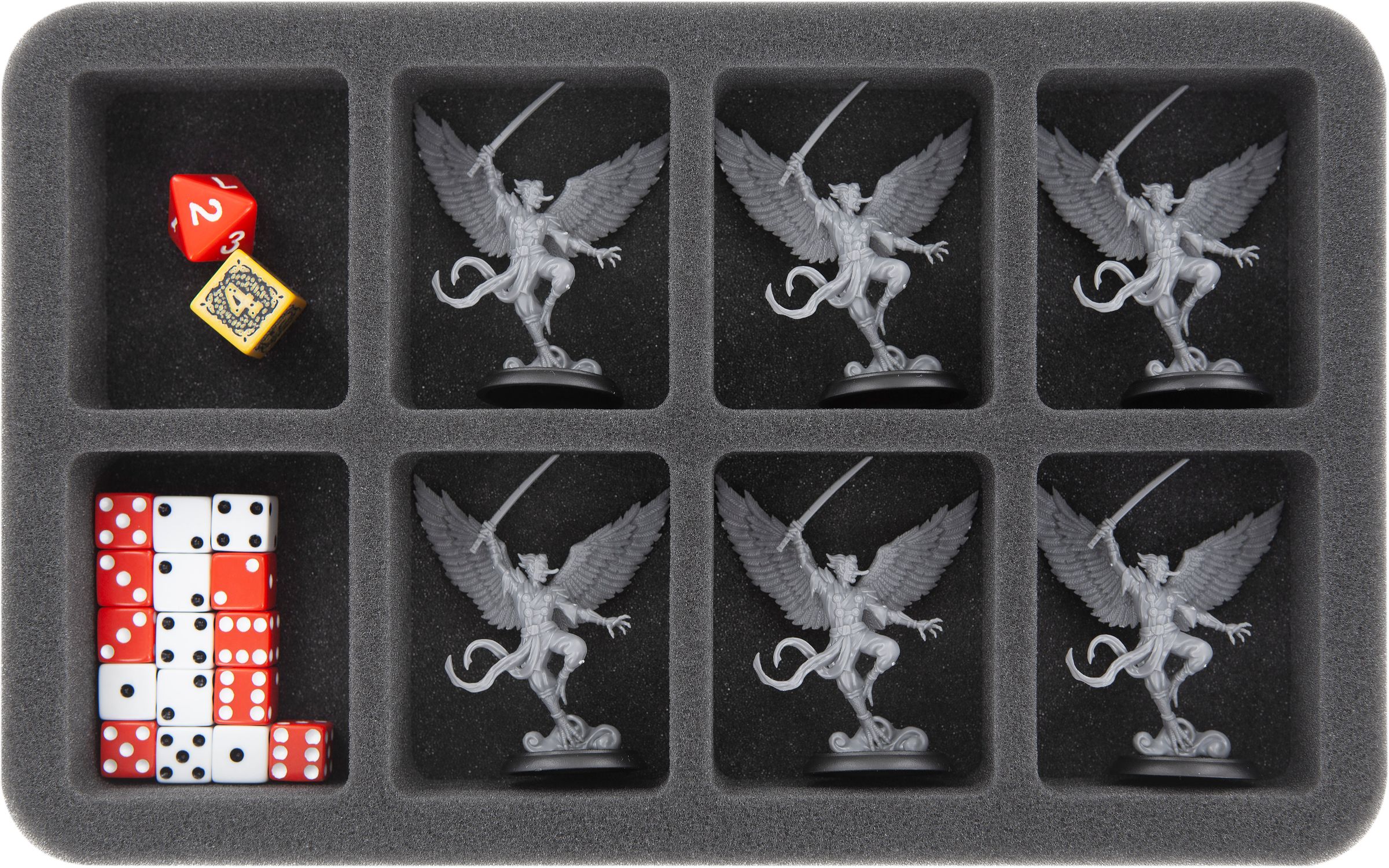 Of course, your game material is as safe as it gets in our fine-pored foam. Delicate parts like swords of your heroes will thus remain unharmed, the color of painted miniatures will not get scratched.