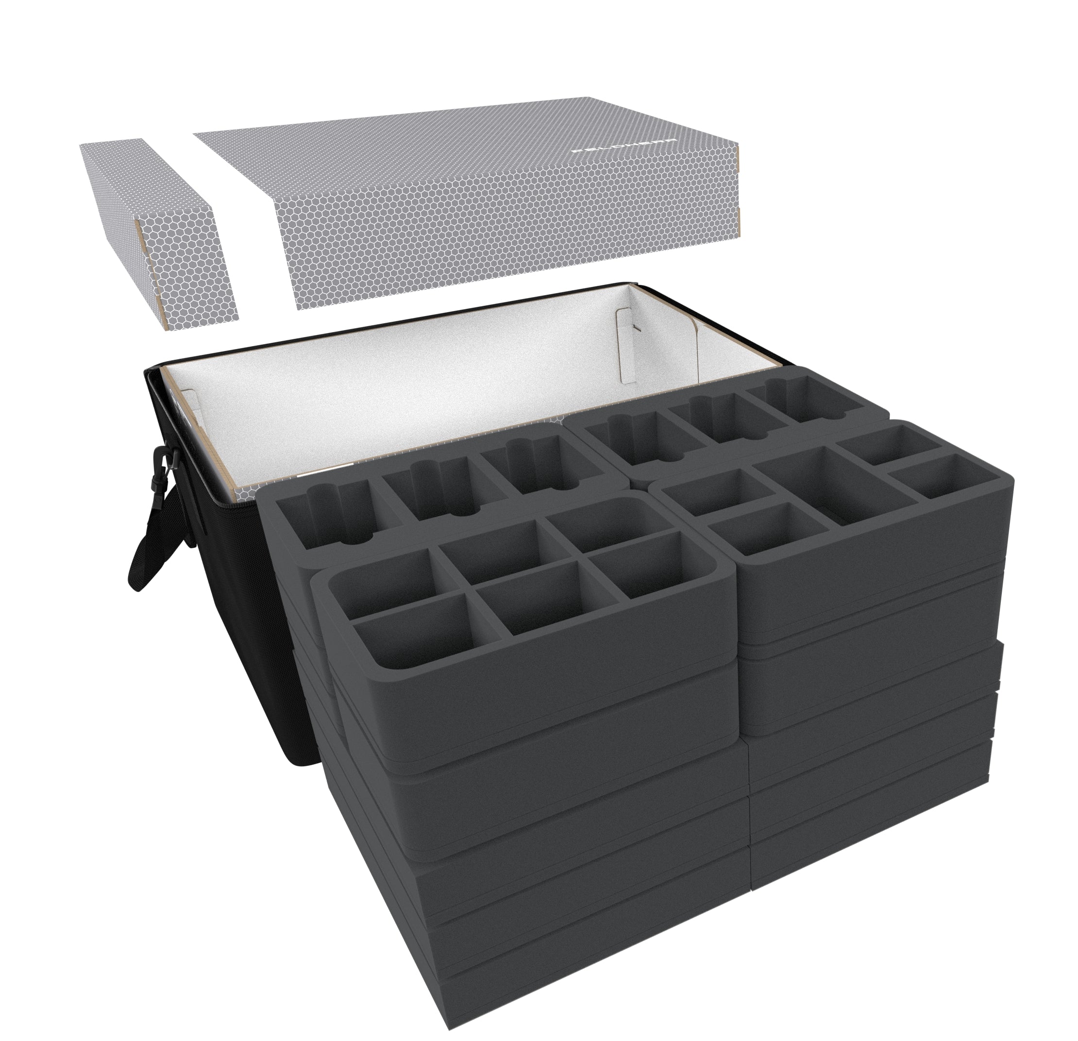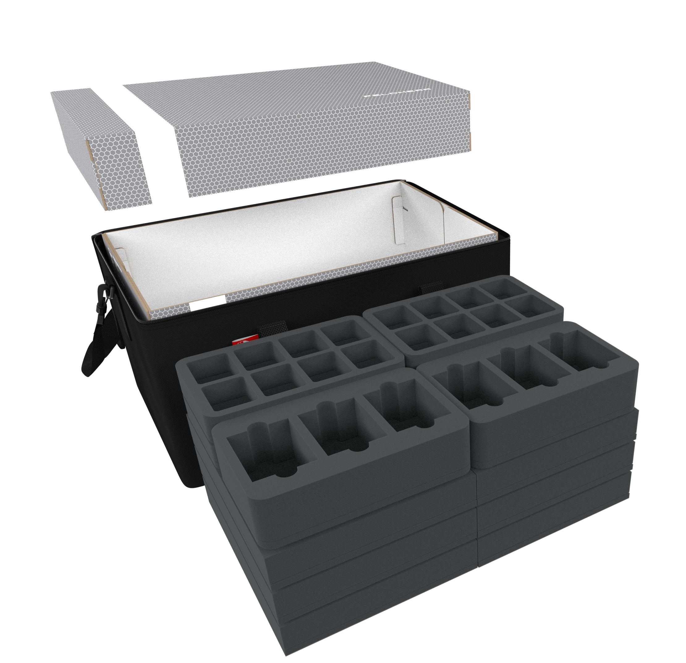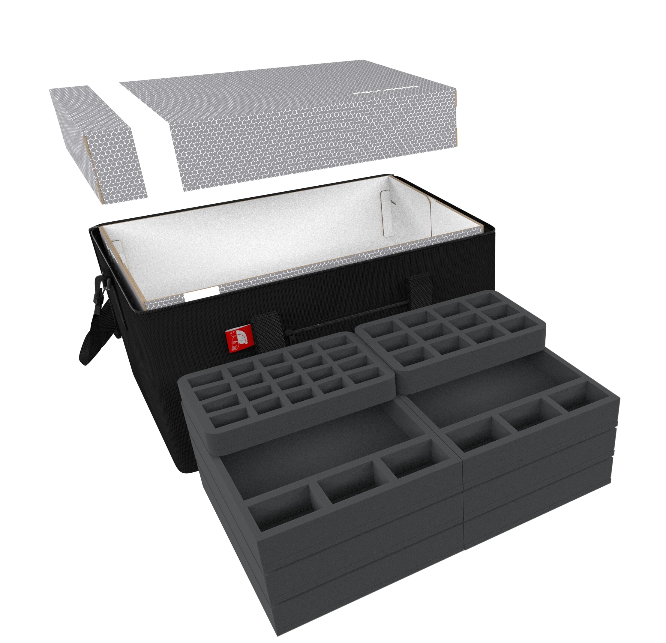 - 2 foam trays with 8 compartments each for medium-sized miniatures (HS040BF02BO)