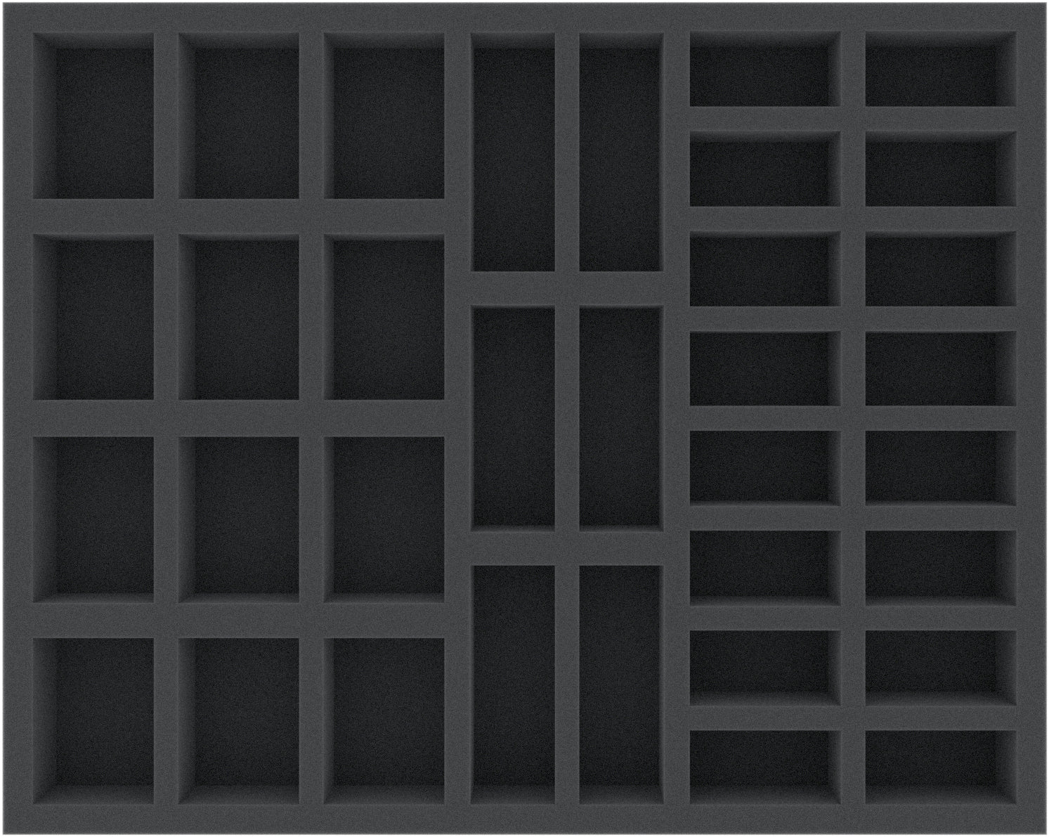 This Feldherr foam tray has 34 compartments for the safe and orderly storage of "Infinity The Game" miniatures. 12 compartments can – depending on the height of the models – accomodate models on 40 mm bases, 22 compartments are suitable for models on 25 mm bases. The fine-pored foam provides reliable protection against damage – fragile parts stay intact, the color of painted models remains unharmed.