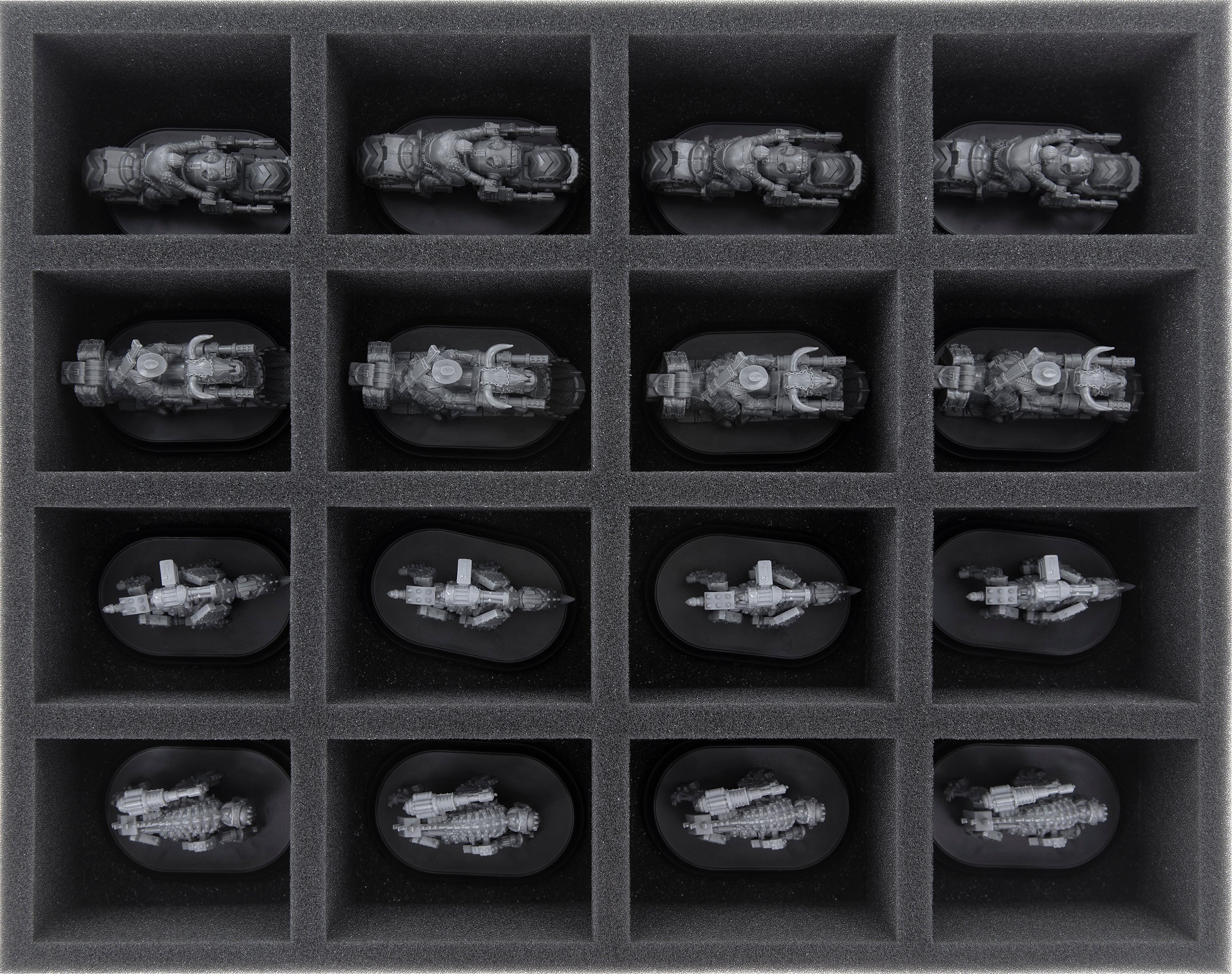 With this Feldherr foam tray up to 16 WWX miniatures are safely stored. The compartments of the same size are ideal for storing units on oval bases in size M(O) clearly arranged and well protected.