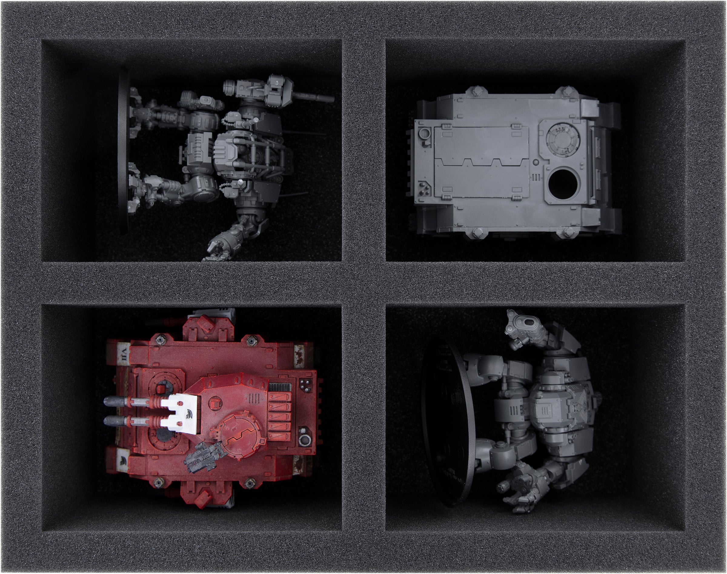 On this Feldherr foam tray you have space for up to 4 large miniatures of your army. The insert is especially suitable for storing the Predator and similar sized models, like the Leviathan Dreadnought.