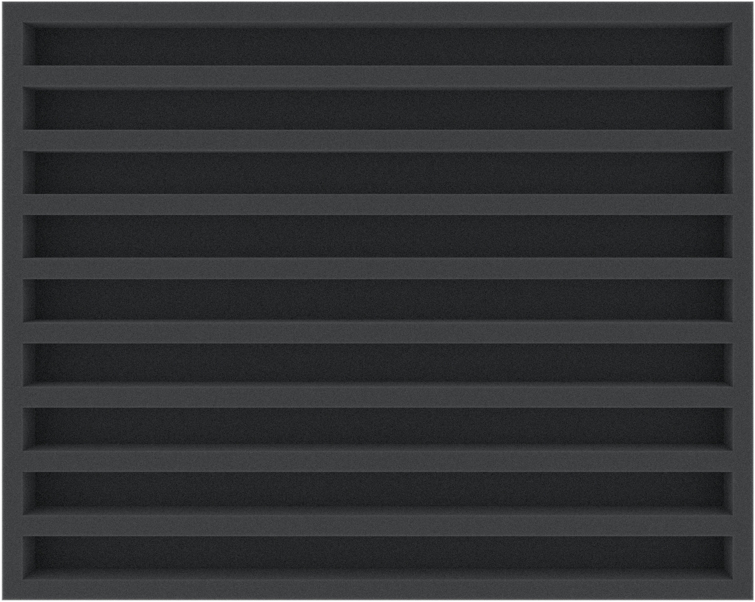 This 30 mm mm high foam tray is divided into 9 compartments. It is particularly suitable for the safe storage of tabletop and board game miniatures, model trains, as well as other fragile models and small parts.
