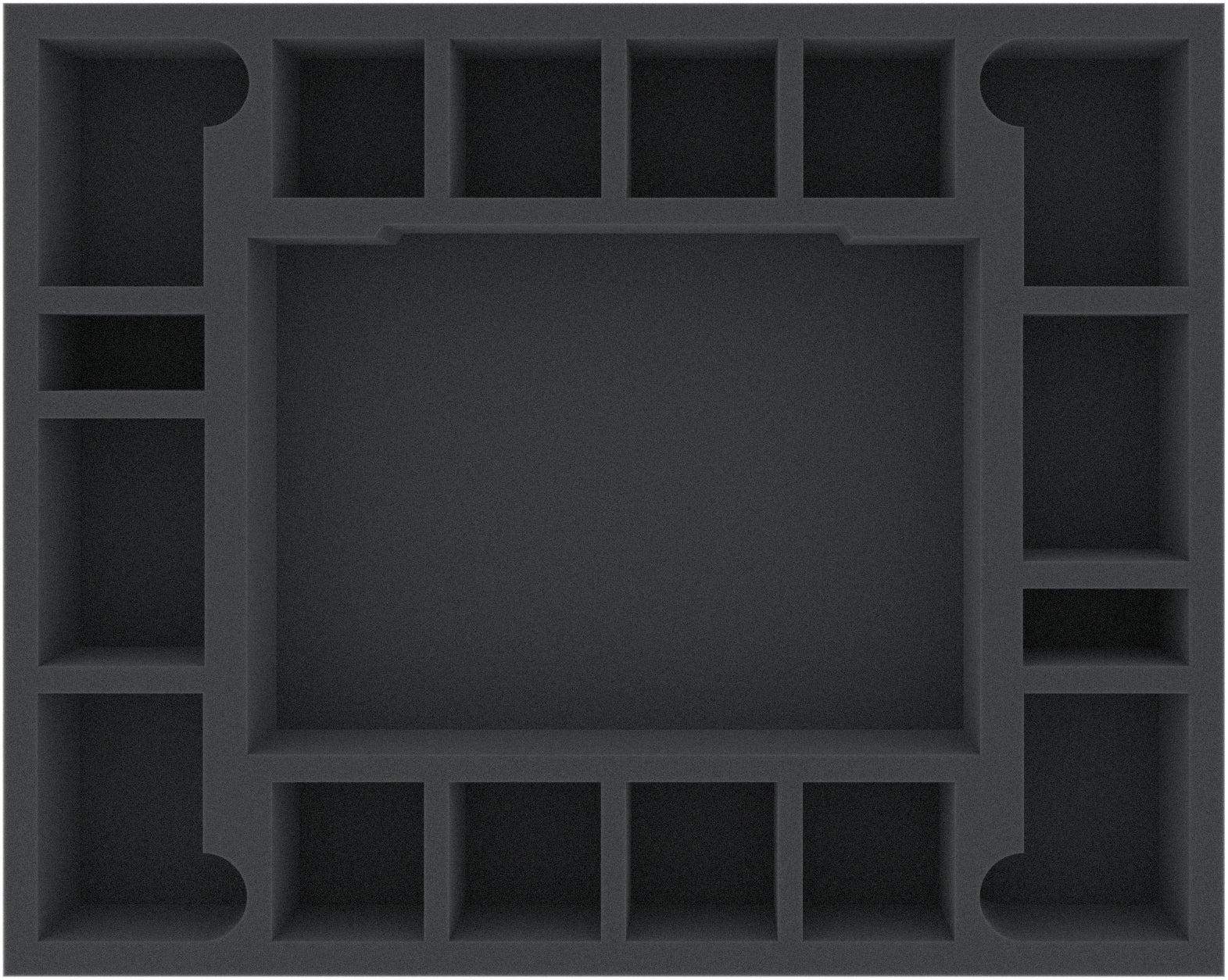 This Full-Size foam insert divides into 17 compartments of different sizes. The insert is particularly suitable for storing game material such as cards, tiles and dashboards, as well as miniatures from various board games and tabletop systems.