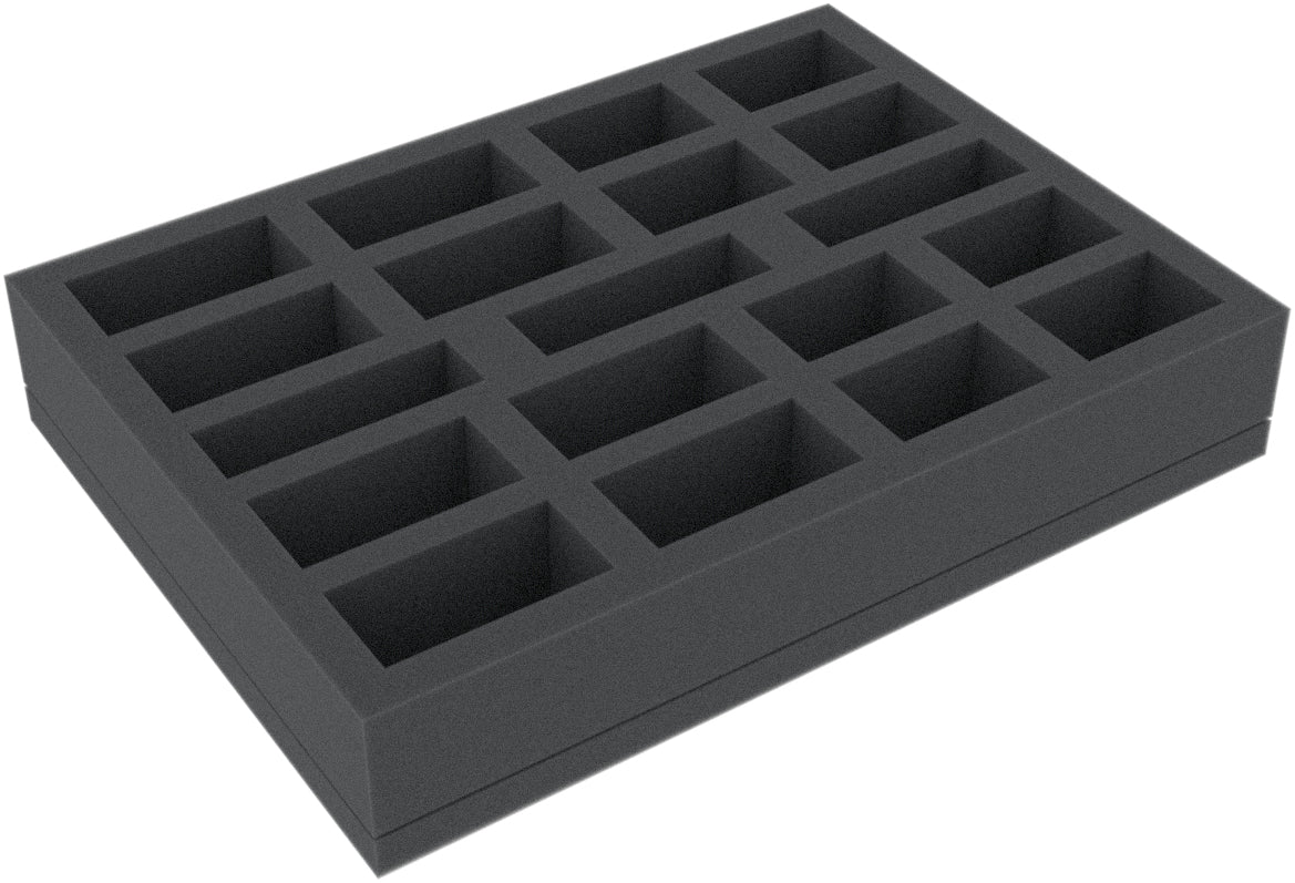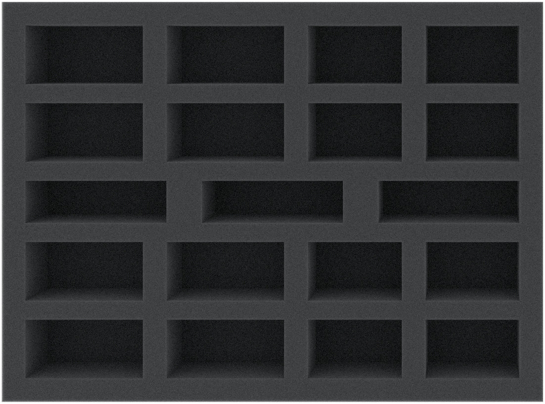 This 40 mm high foam tray is divided into 19 compartments. It is particularly suitable for the safe storage of tabletop and board game miniatures, as well as other fragile models and small parts.