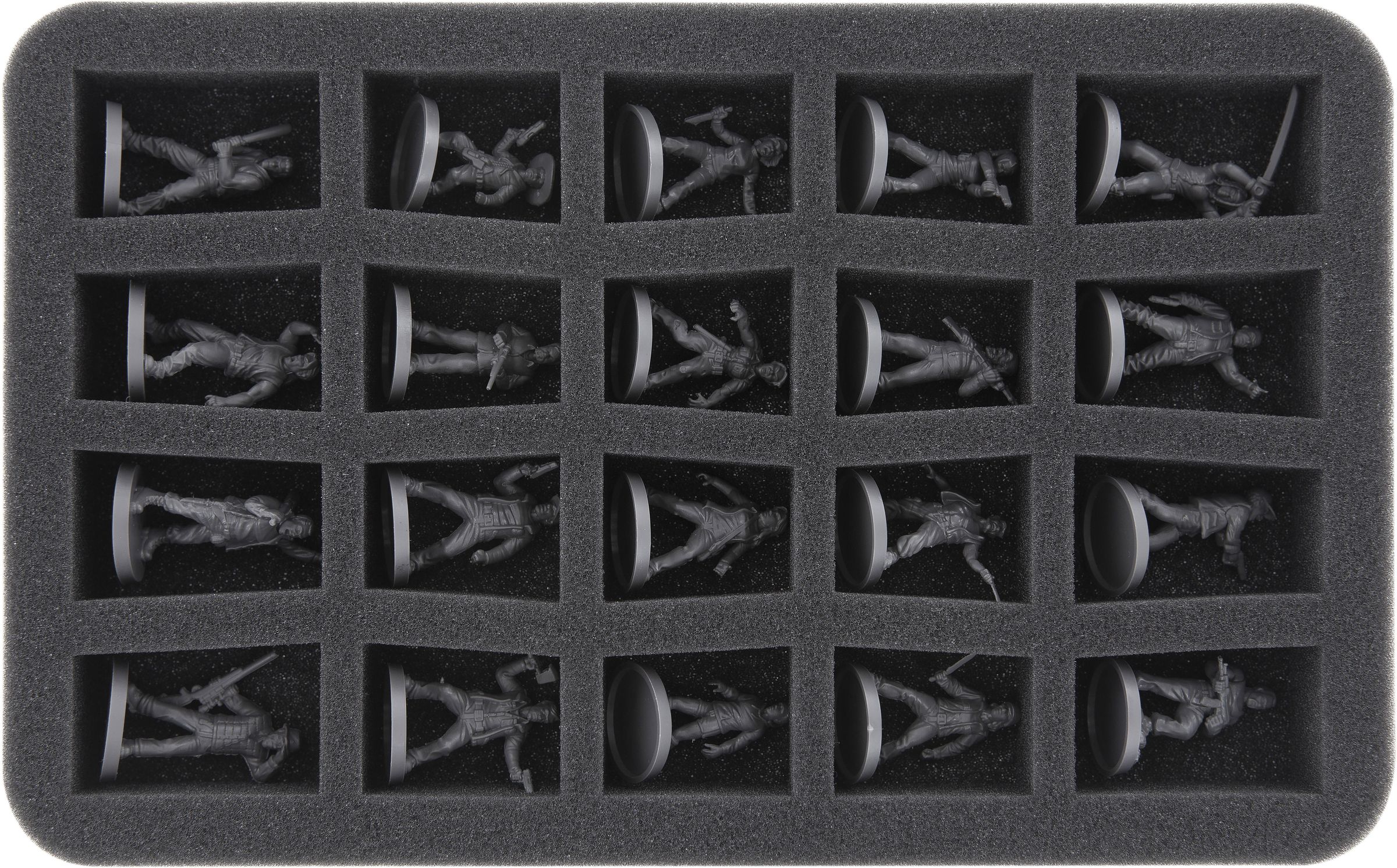 This Feldherr foam tray has 20 same-sized compartments for the clear and safe storage of wargaming miniatures in scale 1:56 (28 mm). The tray is thus ideally suited for miniatures of e. g. the games "Infinity The Game", "Warpath" or “Bolt Action".