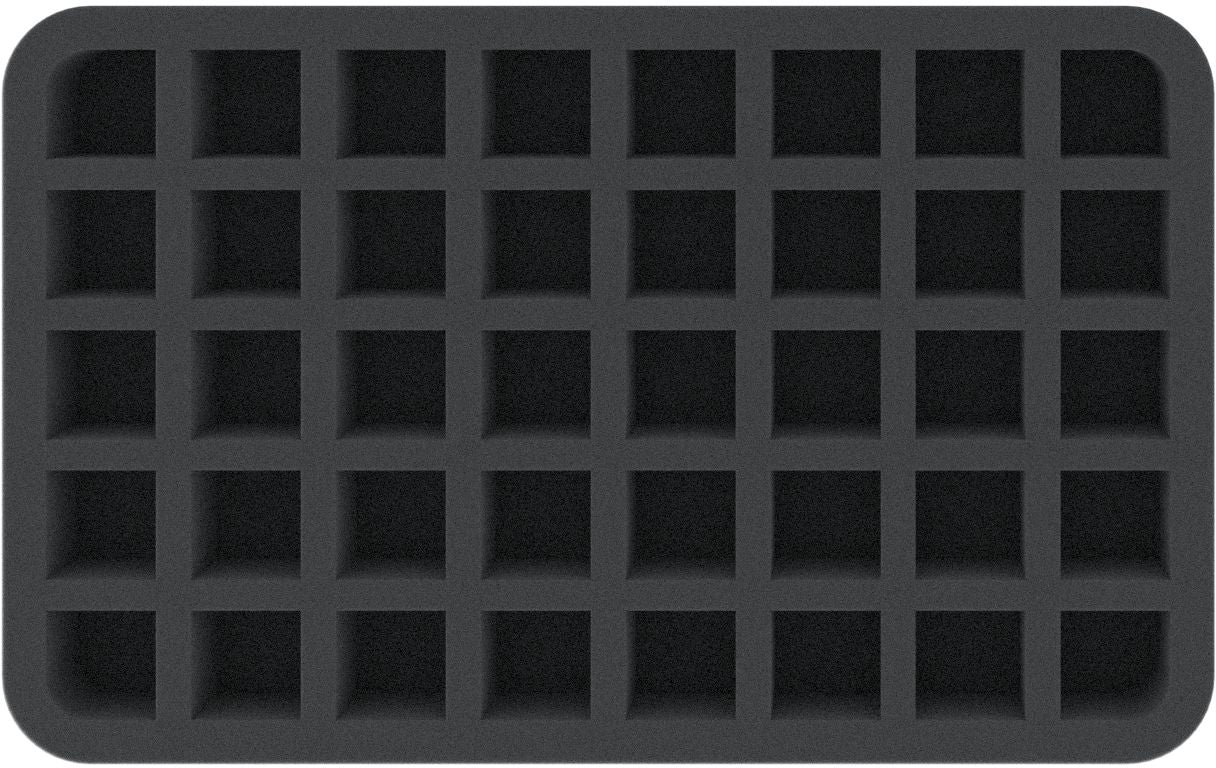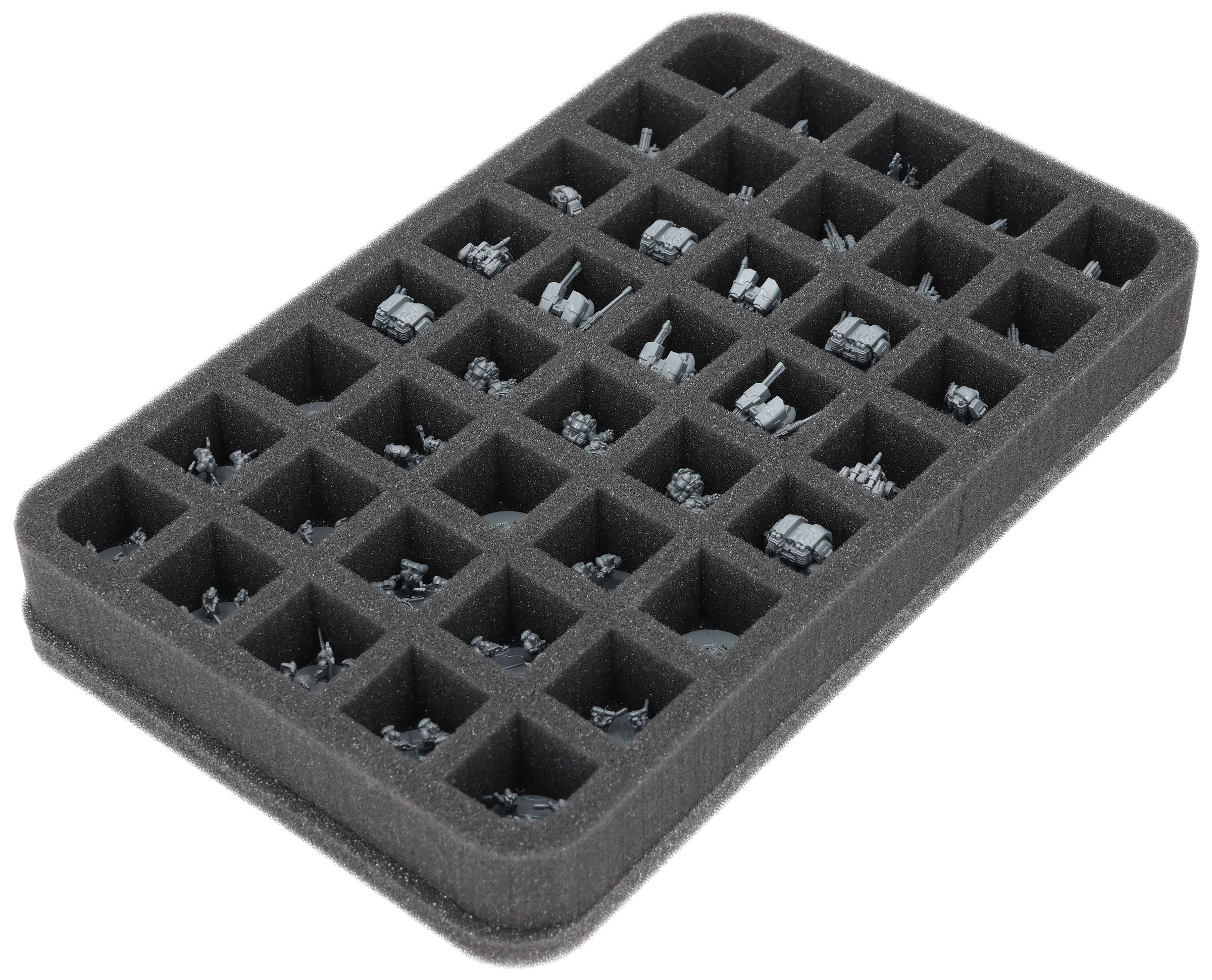 This Feldherr Half-Size foam insert provides space for up to 80 miniatures of your army. The compartments are ideal for storing infantry models of the Legiones Astartes (e.g. Space Marines), Legiones Astartes Support (e.g. Leviathan Dreadnoughts, Legion Rapier, Legion Tarantula), as well as troops of the Solar Auxilia, Solar Auxilia Support (e.g. Auxilia Rapier, Auxilia Tarantula, Solar Auxilia Cyclops), and miniatures with similar dimensions.