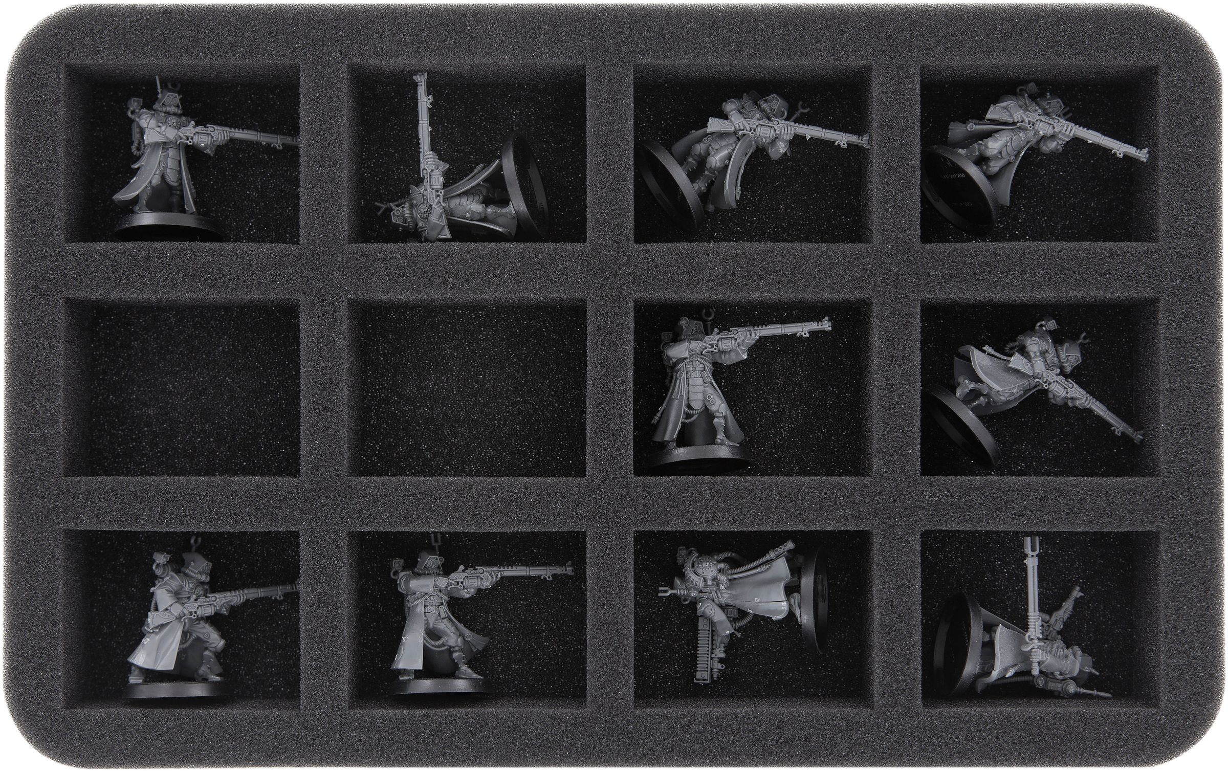 This Half-Size foam tray has 12 compartments. It is best suited to clearly and safely store your Warhammer models with round or square 25 mm base. Sensitive parts of the figures are protected from damage and the painted miniatures are preserved.