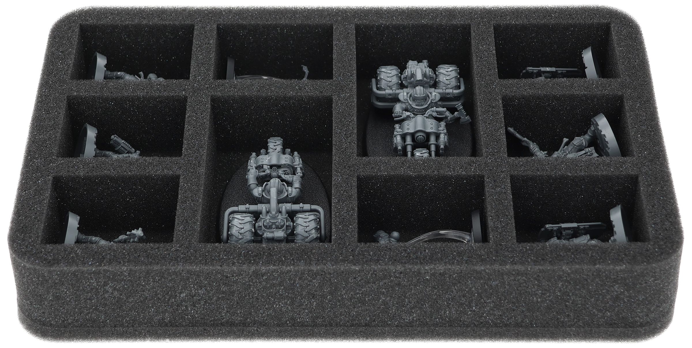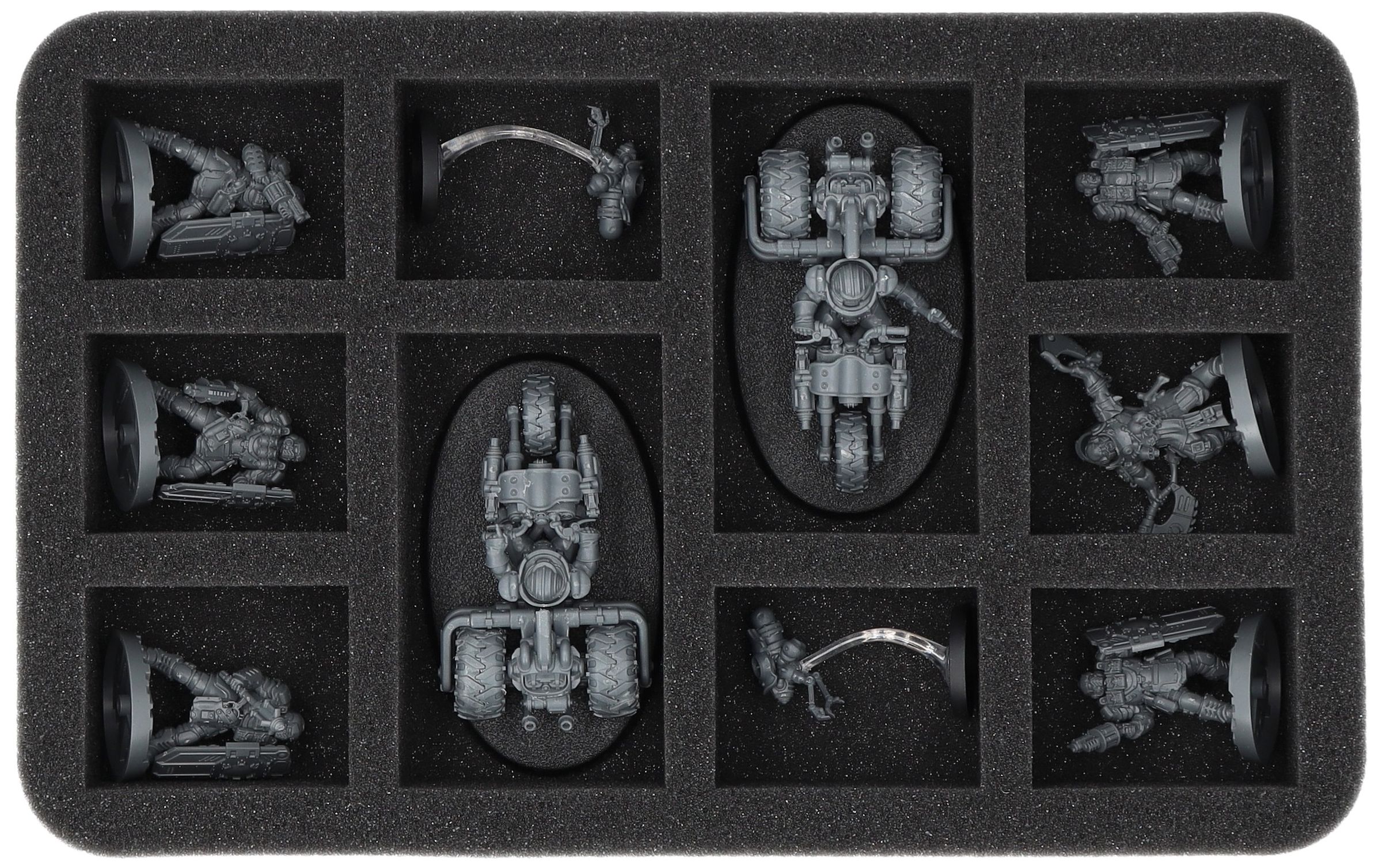 On this Feldherr foam tray you have space for up to 10 miniatures of your army. The insert is especially suitable for storing the Ironhead Squat Svenotar Scout Trikes and similar sized models.