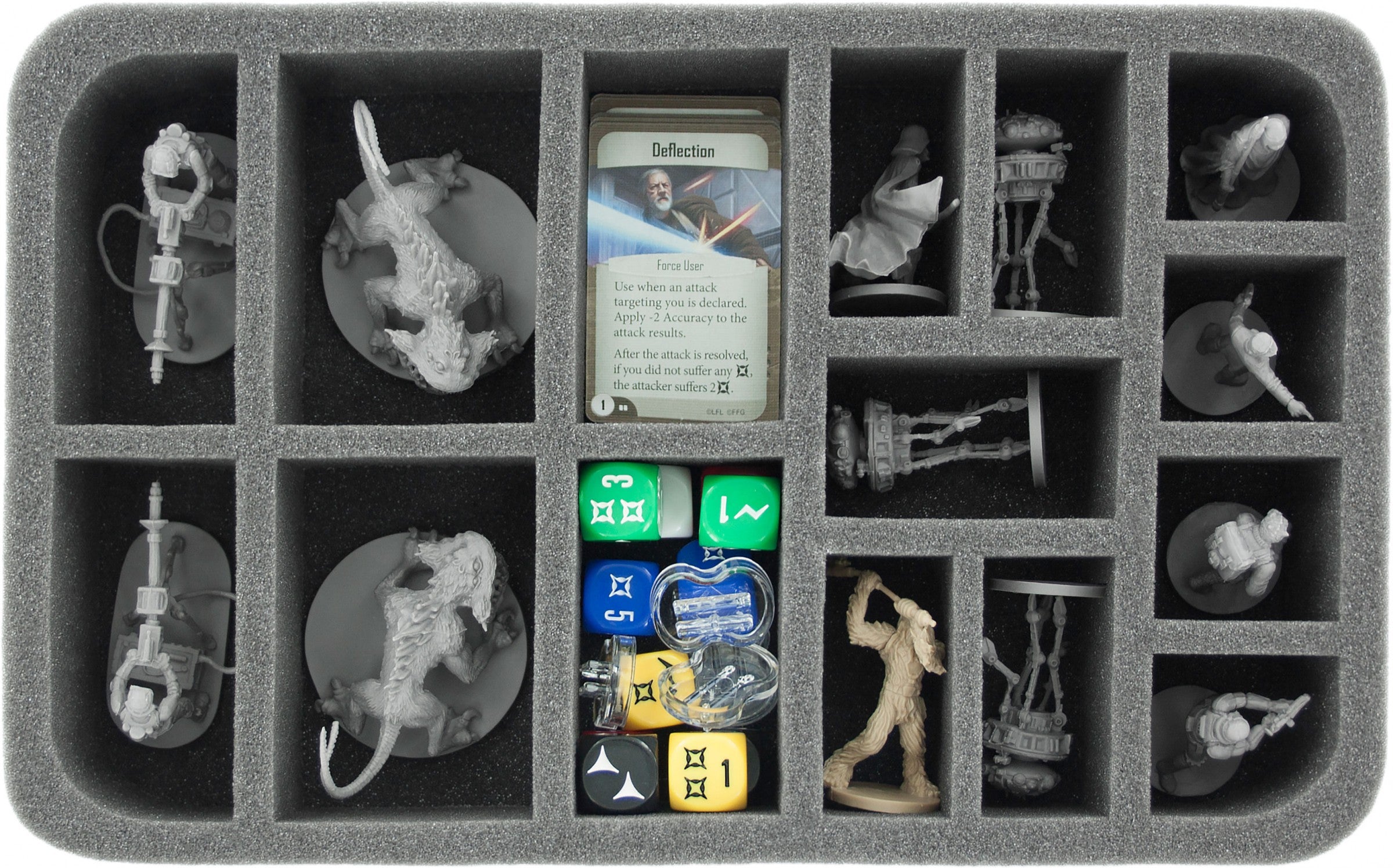 Idéal pour les Mini de Star Wars Imperial Assault comme Storm Trooper, Heros, E-Web Engineers, Jedi ou Nexu. Chaque fente a une profondeur de 40 mm. Prêt à l'emploi - base en mousse collée de 10 mm.