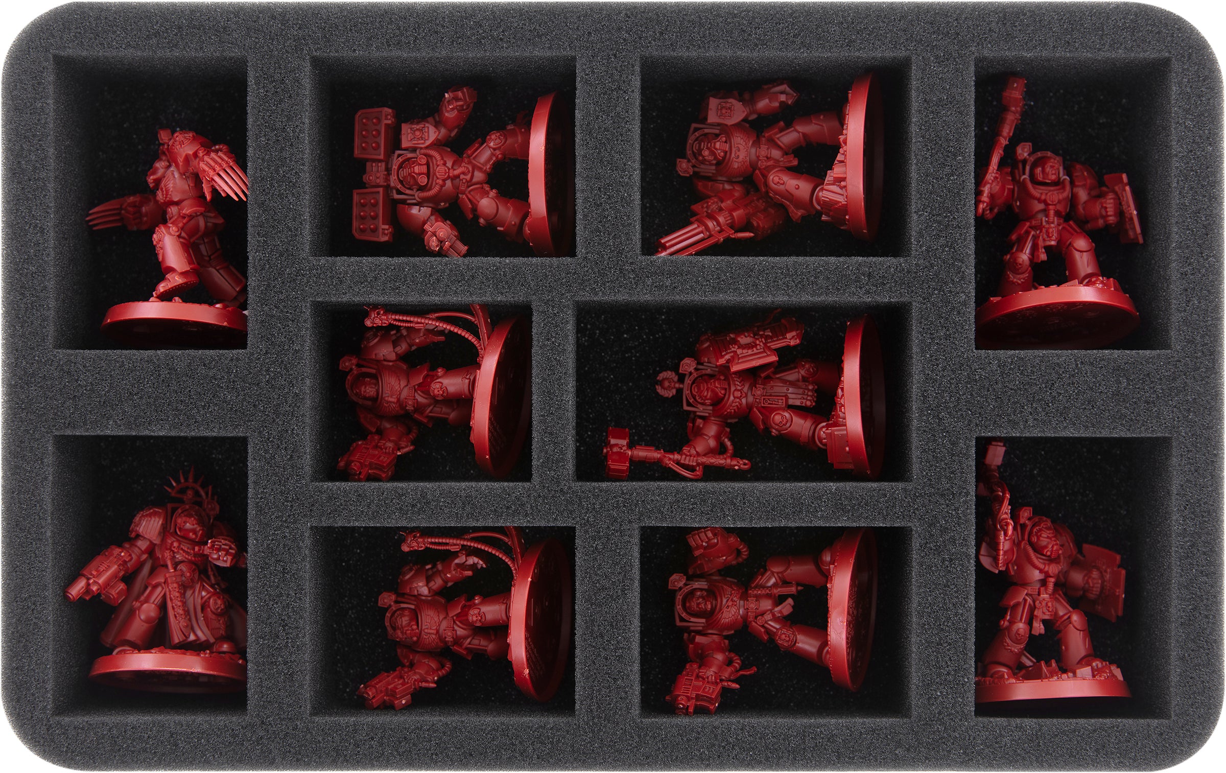 This Half-Size foam tray is divided into 10 compartments. The compartments of four different sizes are ideal for storing larger or wider models of the Adeptus Astartes neatly and securely. It is particularly suitable for Primaris Aggressors, Eradicators or the warriors of the Assault Squad, for example. Models with the dimensions of a Primaris Captain, Primaris Lieutenant, a Chaplain, or Assault Intercessors are also in good hands here.