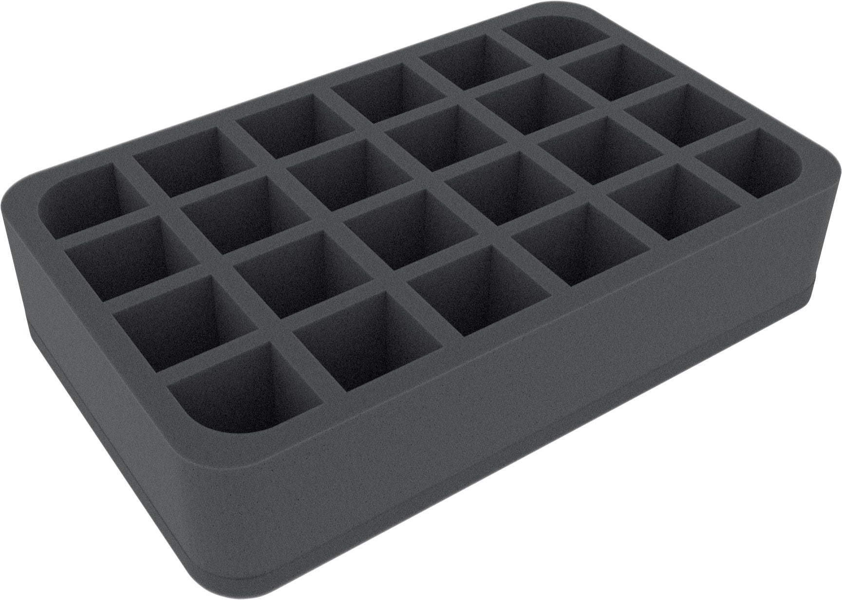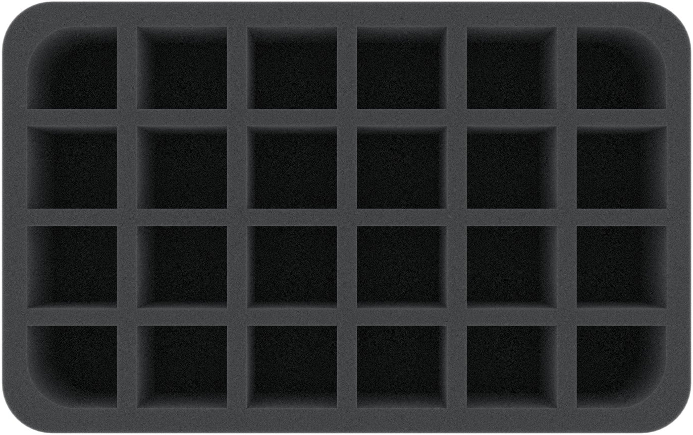 This Feldherr foam tray has 24 same-sized compartments for the safe and orderly storage of "Infinity The Game" miniatures on 25 mm bases. The fine-pored foam provides reliable protection against damage – fragile parts stay intact, the color of painted models remains unharmed.