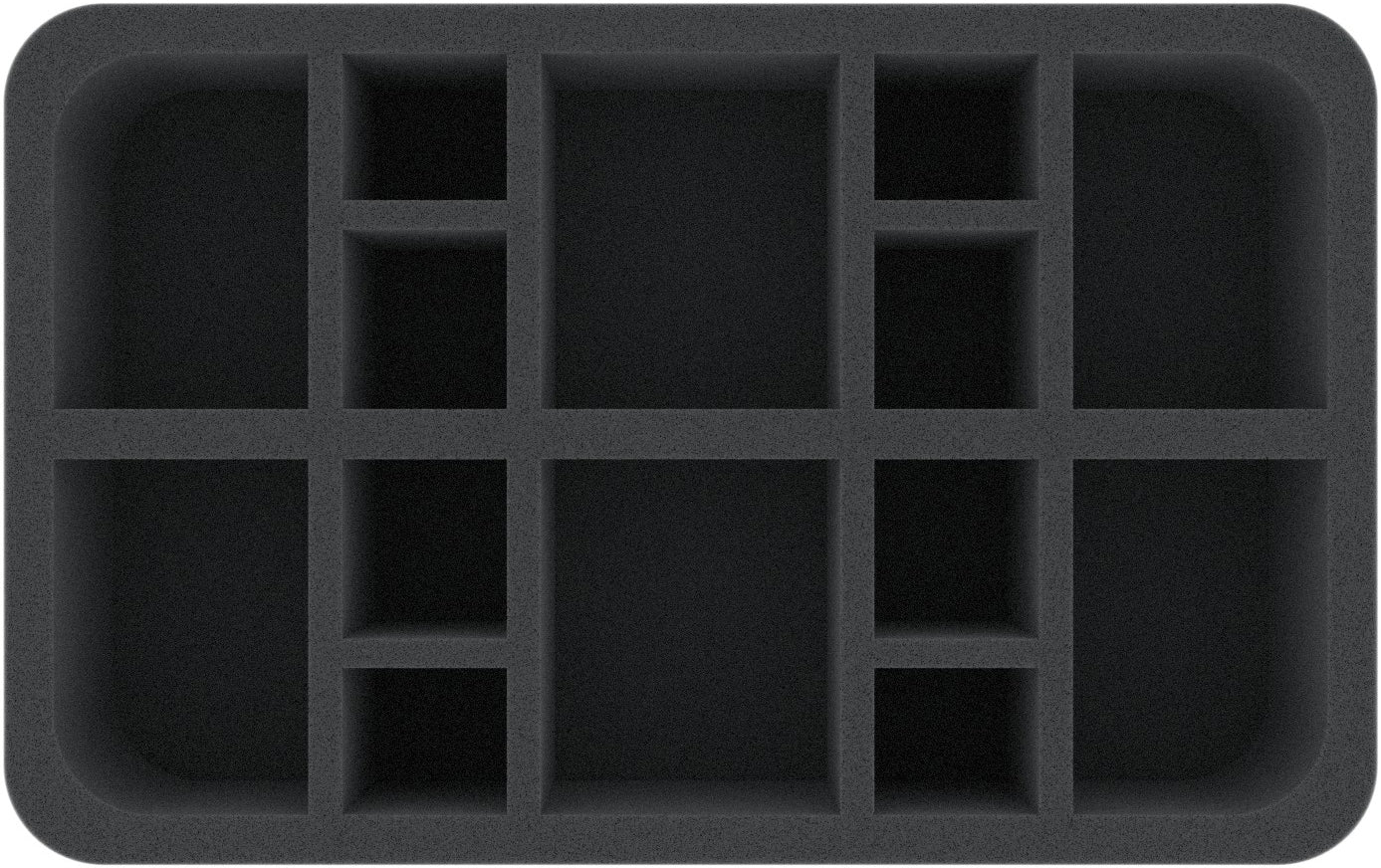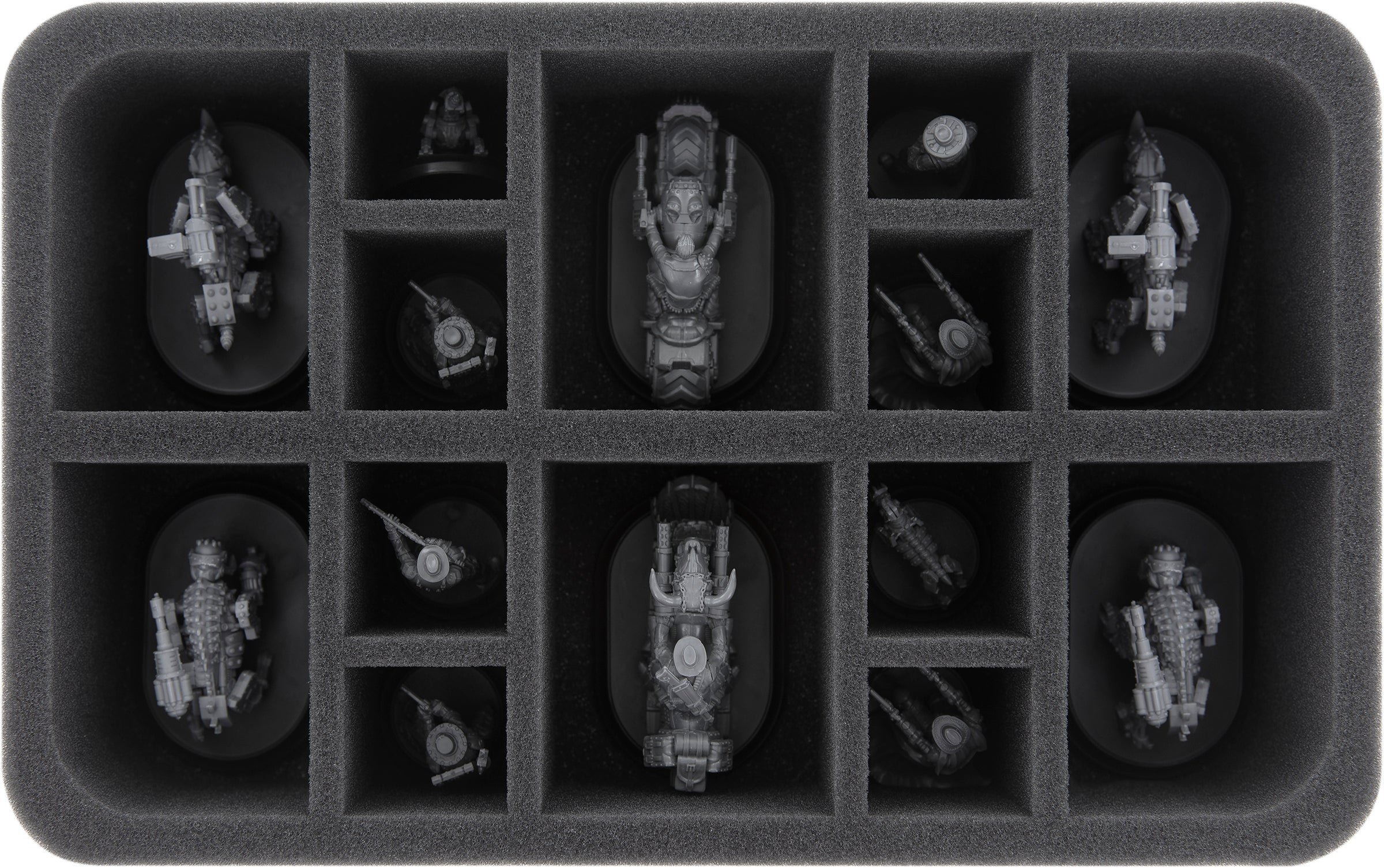 On this Feldherr foam tray you can safely store up to 14 WWX miniatures of mixed sizes. The compartments of different sizes are ideal for storing units on oval bases in size M(O) as well as standard units on round bases in size S in a clear and well protected way.
