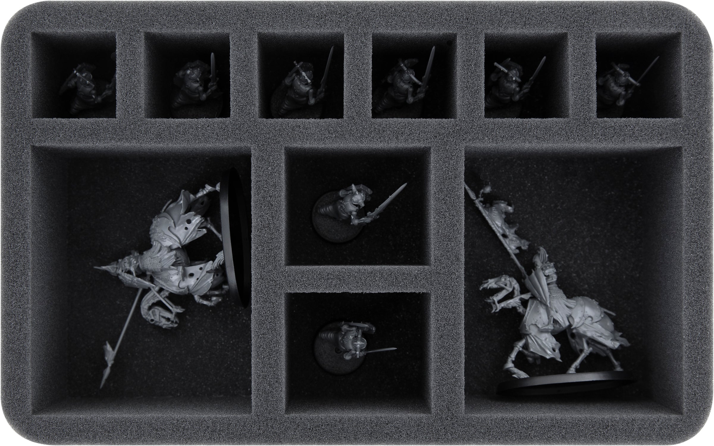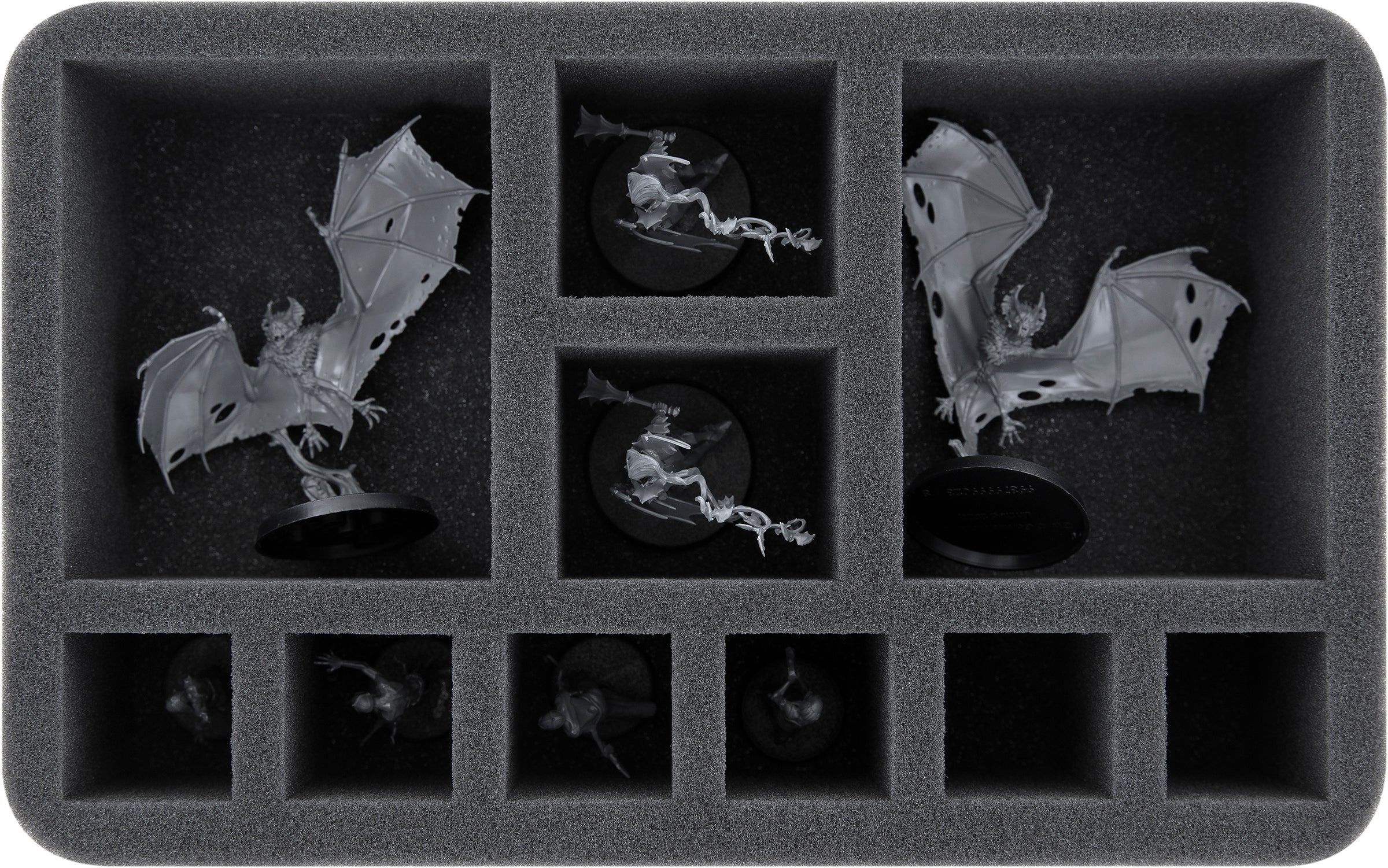 On this Feldherr foam tray you have space for up to 10 miniatures of your army. The insert is especially suitable for storing Fell Bats, Vampire Lord and similar sized models.
