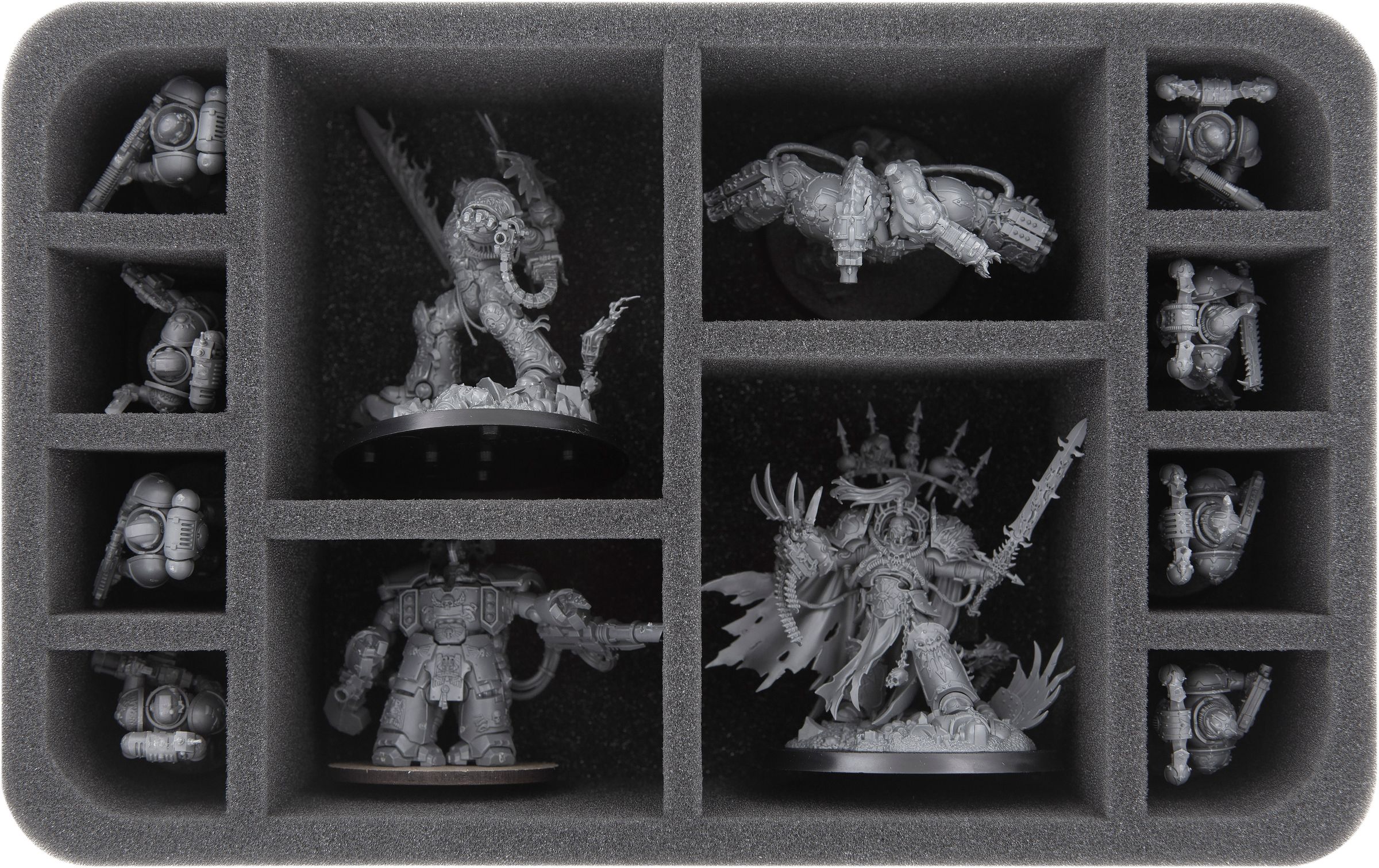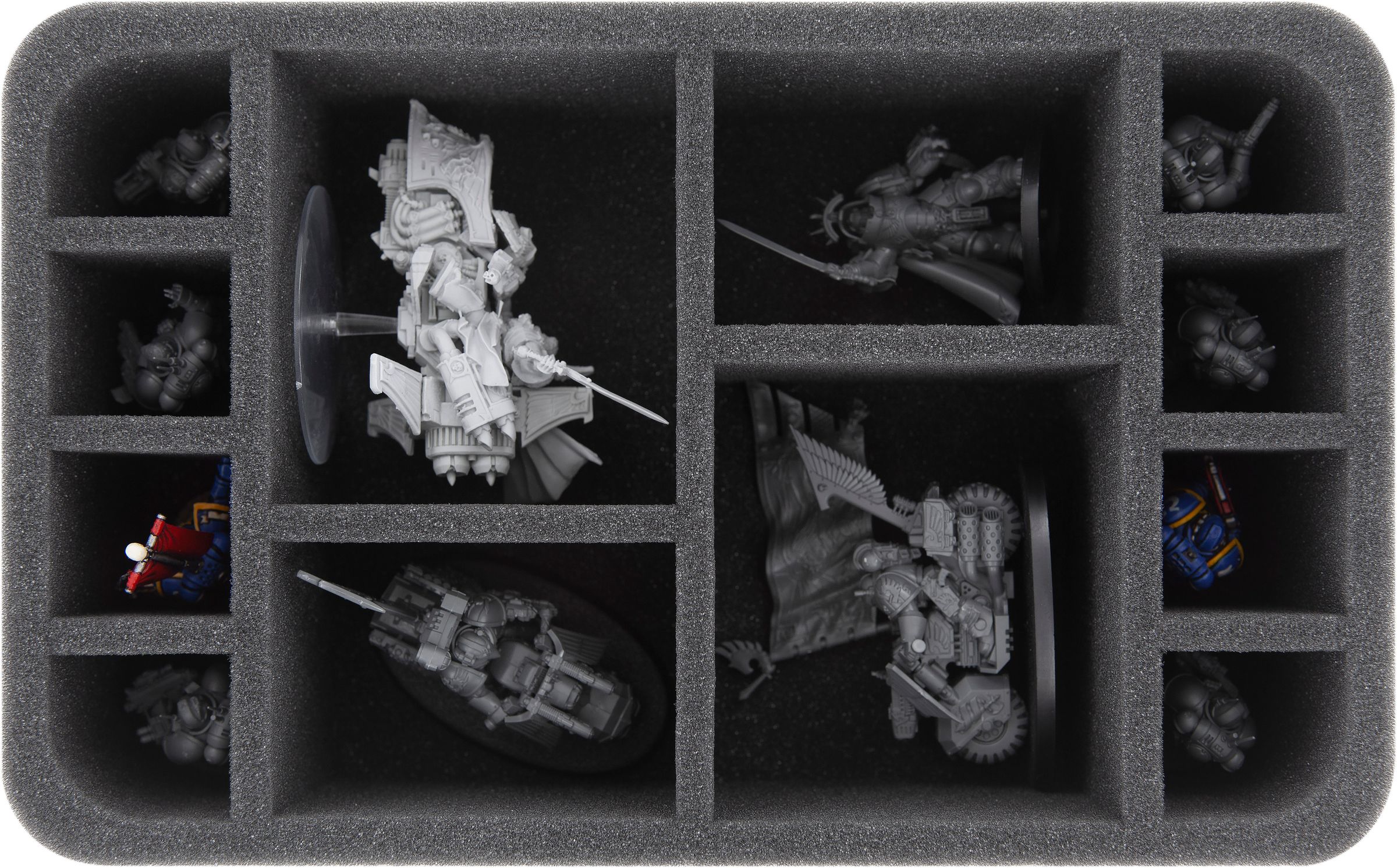 The four large compartments are ideal for bigger miniatures, such as the Primarch of the Ultramarines Roboute Guilliman, Centurions and Space Marine Bike Squad models (e.g. Ravenwing and Scout, also Sammael). Also suitable for the Contemptor Dreadnought.