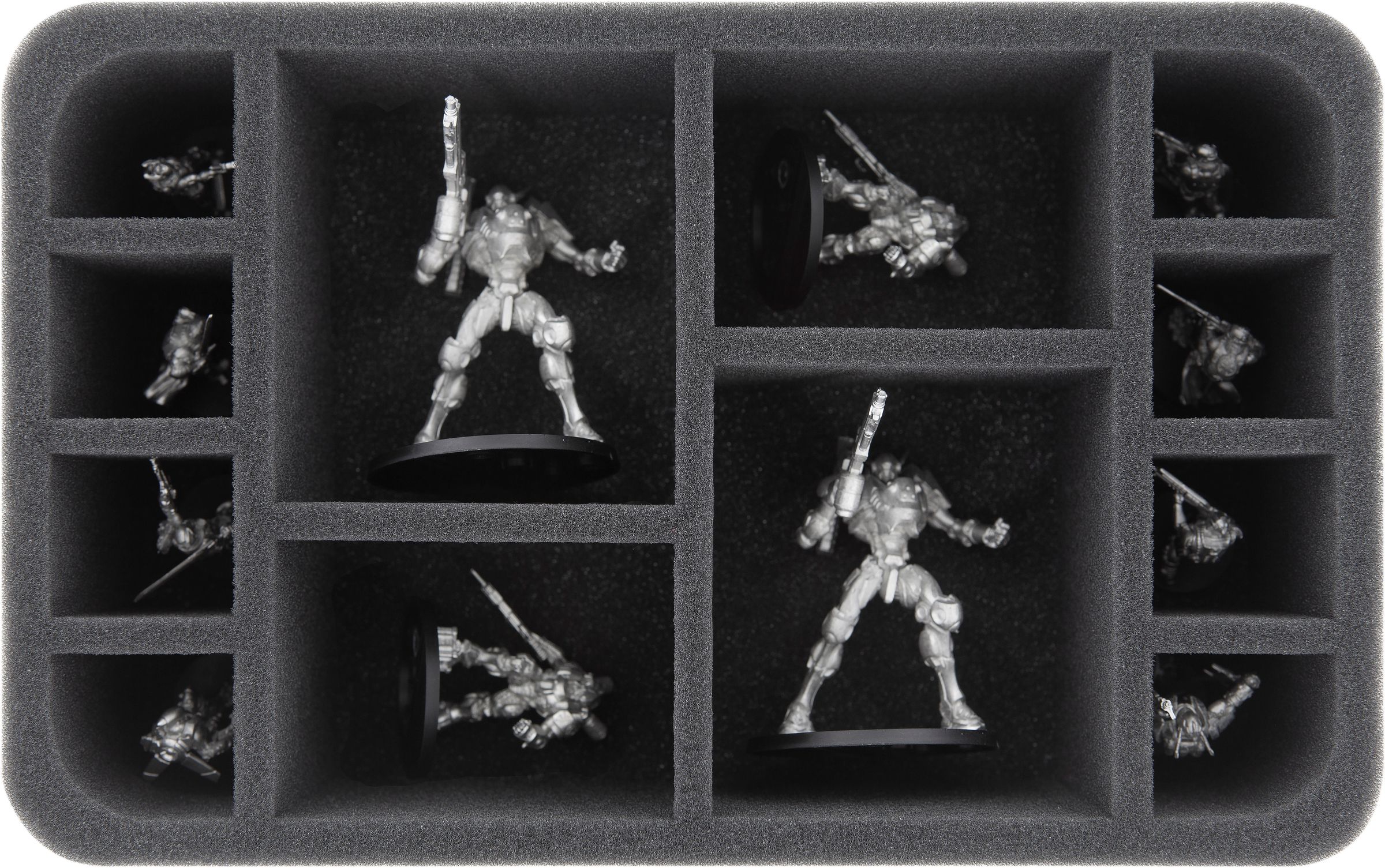 This Feldherr foam tray has 12 compartments for the safe and orderly storage of "Infinity The Game" miniatures. Four large compartments will hold figures on 55 mm bases, eight small compartments are suitable figures on 25 mm bases.