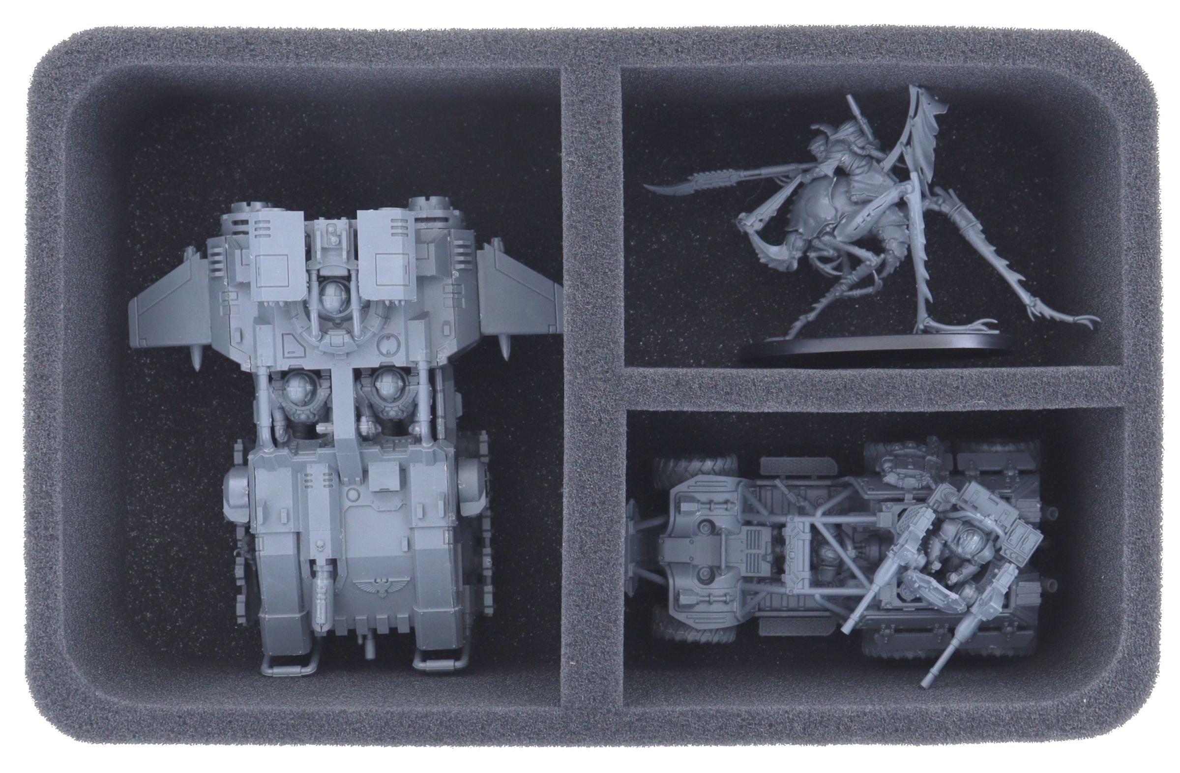 On this Feldherr foam tray, you have space for up to 3 miniatures from your Necromunda collection. The compartments are ideal for safely storing bulky units like the Palatine Enforcer Taurus Venator, Ash Waste Nomads Dustback Helamite, and miniatures with similar dimensions.